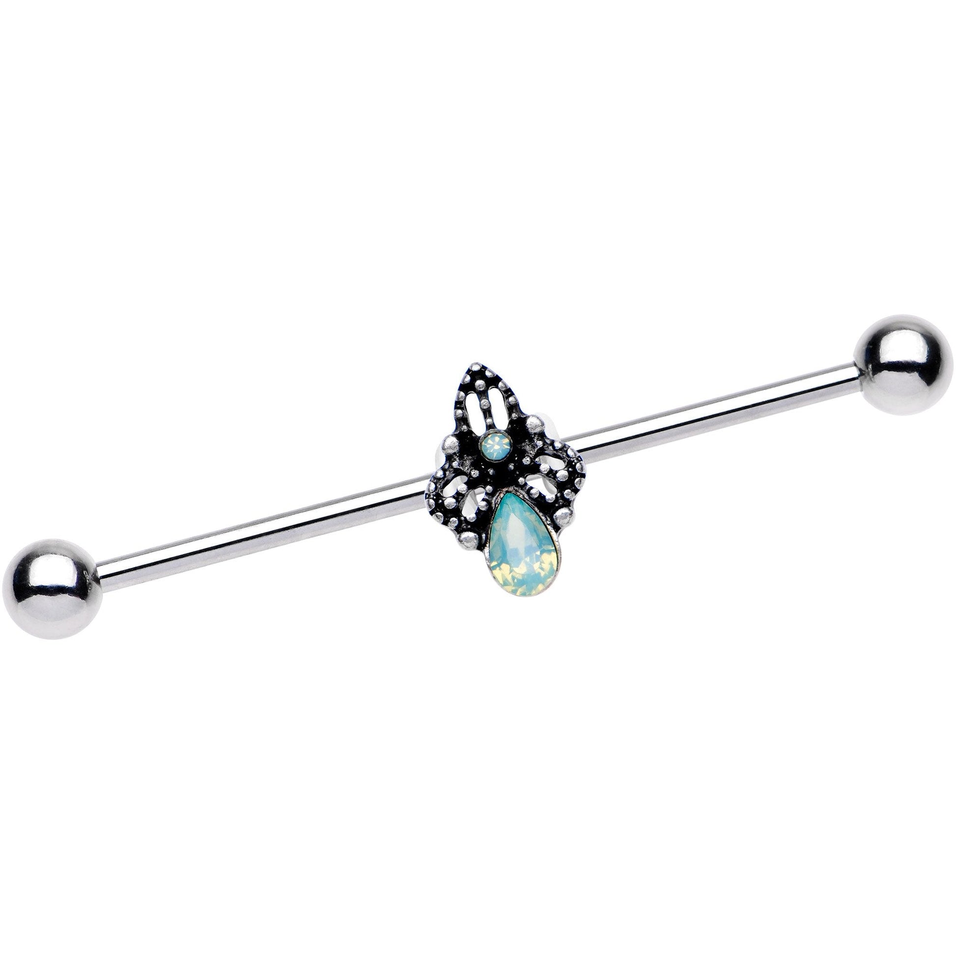 Sophisticated and glamorous, this industrial barbell is the perfect addition to your collection! This 14 gauge industrial piercing features a raindrop-shaped green gem and a small round green gem framed by an ornate Victorian-style design. The moveable Victorian raindrop charm is set on a 1 1/2" straight barbell made with durable 316L surgical grade stainless steel.