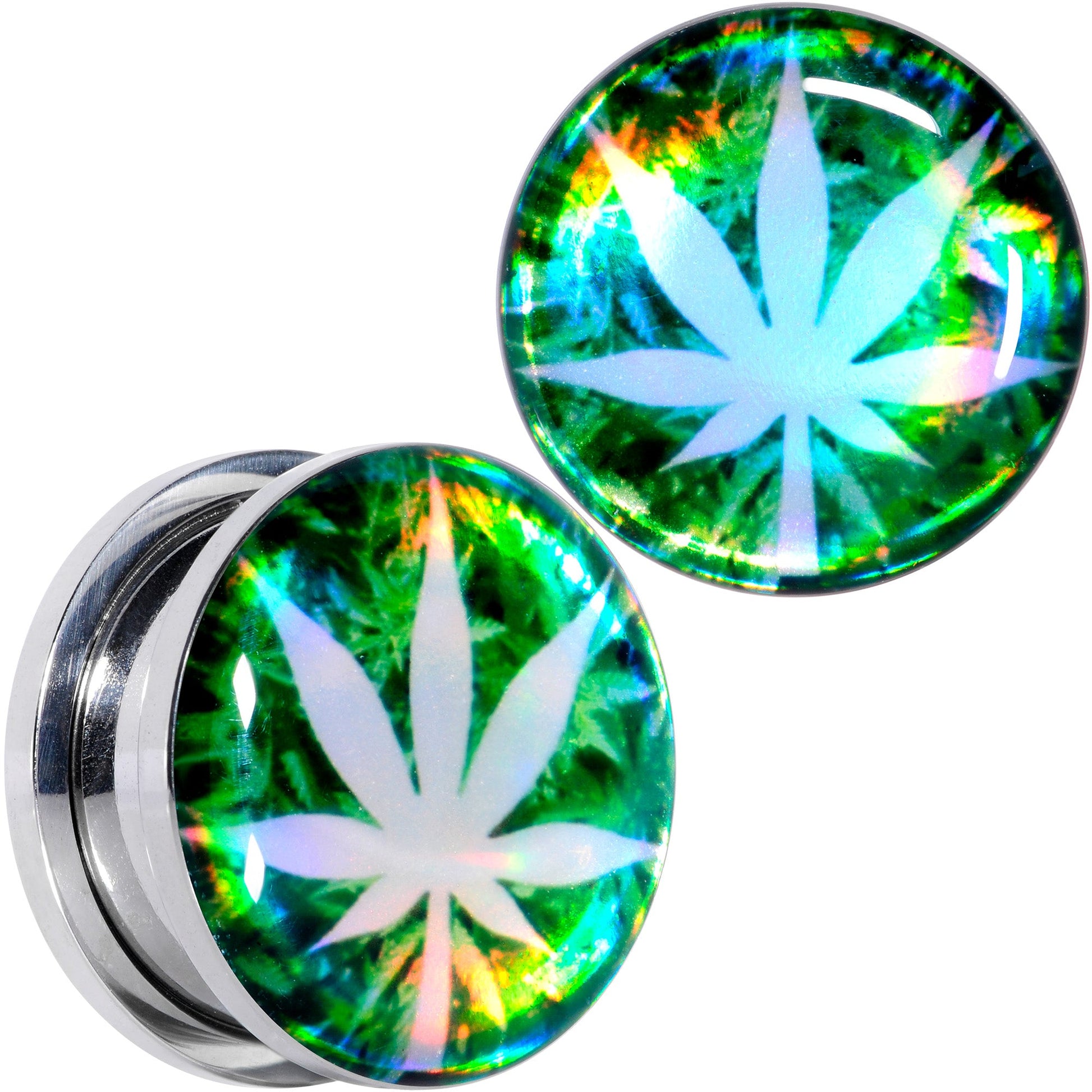 Spark it up with these 420-friendly double flare plugs! Made with 316L surgical grade stainless steel, these ear gauges are screw fit for easier insertion and removal and feature pot leaf silhouettes on green backgrounds with a holographic effect that's fun, trippy, and perfect to make your smoking buds jealous! Sold as a set of two.Specifications