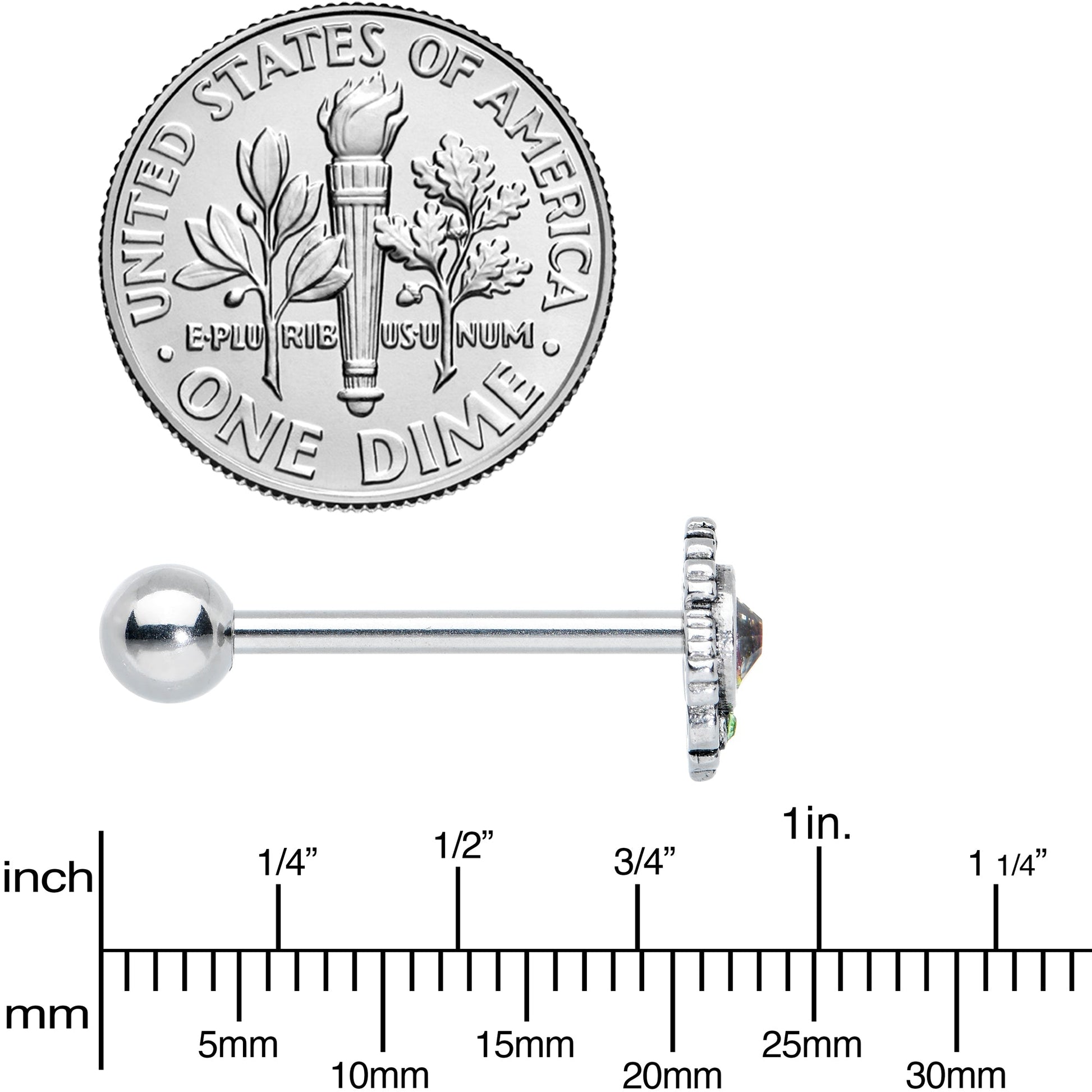 This 14 gauge tongue jewelry is absolutely fire! It's made with a 5/8" durable 316L surgical grade stainless steel straight barbell with a 5mm bottom ball end. The top end features a scalloped, oval charm. The charm is set at the center with a green tourmaline that shifts to orange for a look that is truly lit. It's further embellished with a small yellow gem. You can't help but feel the heat when you're wearing this fiery tongue piercing jewelry!Specifications