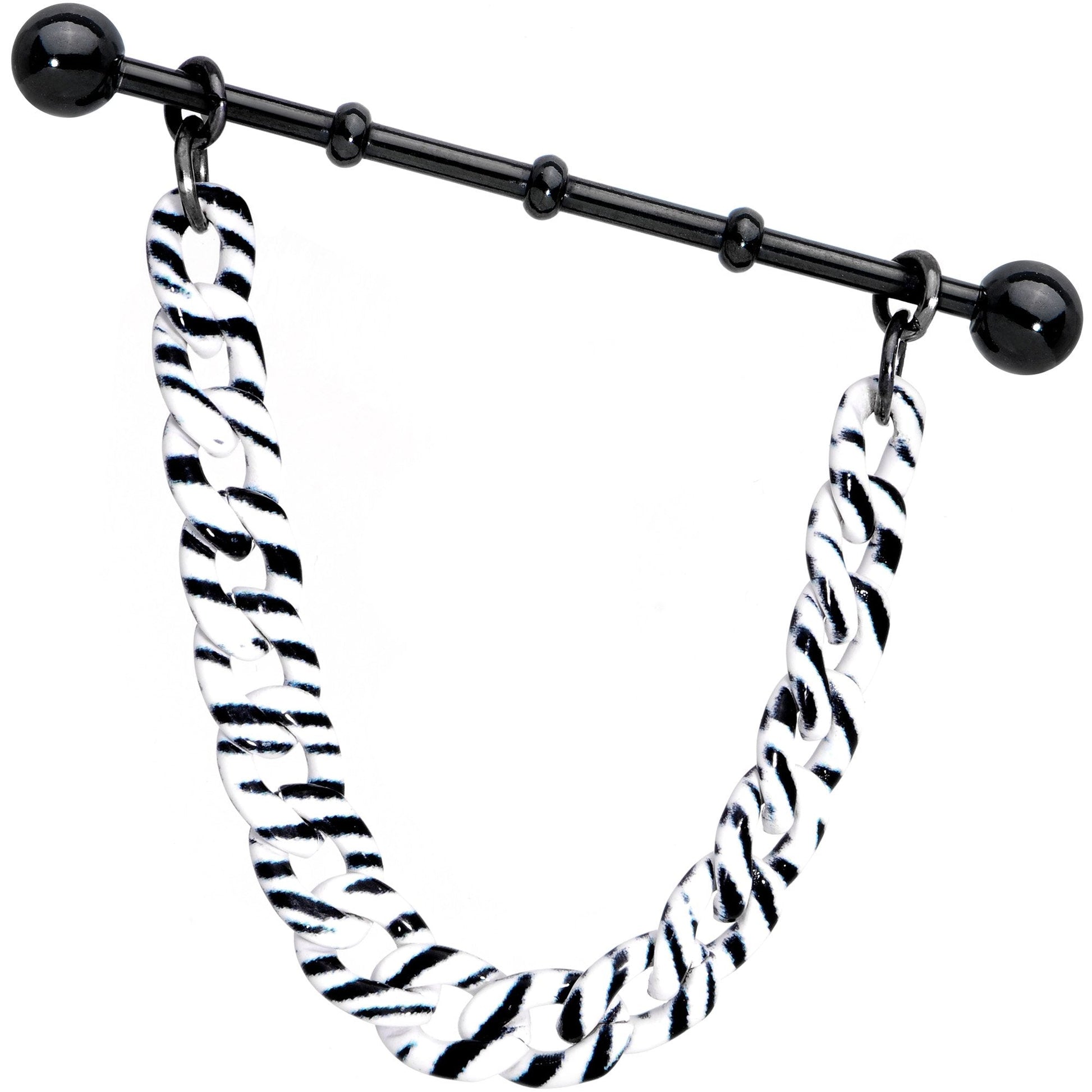 Feel like you're on safari with this wild zebra striped industrial barbell. This 14 gauge industrial barbell features a zebra stripe curb chain link dangle for a blast of wild style. The zebra stripe chain dangles from a 1 1/2" straight barbell made with black anodized titanium over 316L surgical grade stainless steel. Handmade in the USA!
