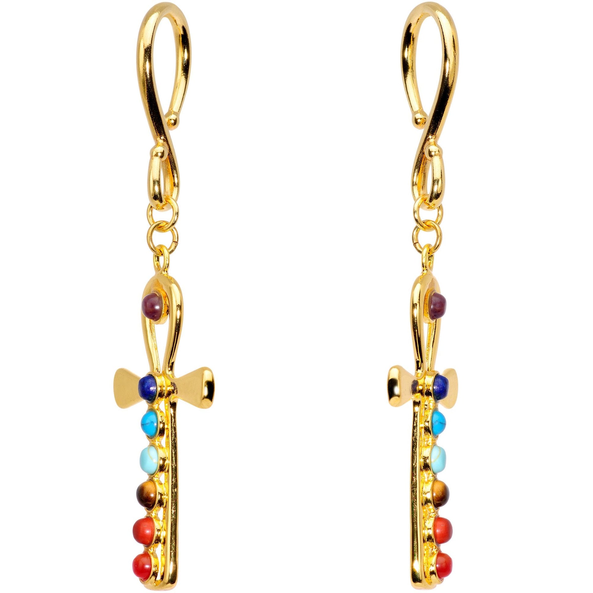 Embrace your inner balance while getting in touch with your outer beauty when you wear this pair of handcrafted dangle tunnel plug earrings. Made with gold plated over pewter hook backings, these stretched ear hangers require an 8 gauge minimum size, can be worn alone or with tunnel plugs, and feature Egyptian ankh dangle charms set with color accents that align with the chakras. With a total length of 89mm and a weight of .63oz, these ear weights are handmade in the USA and are sold as a set of two for you.