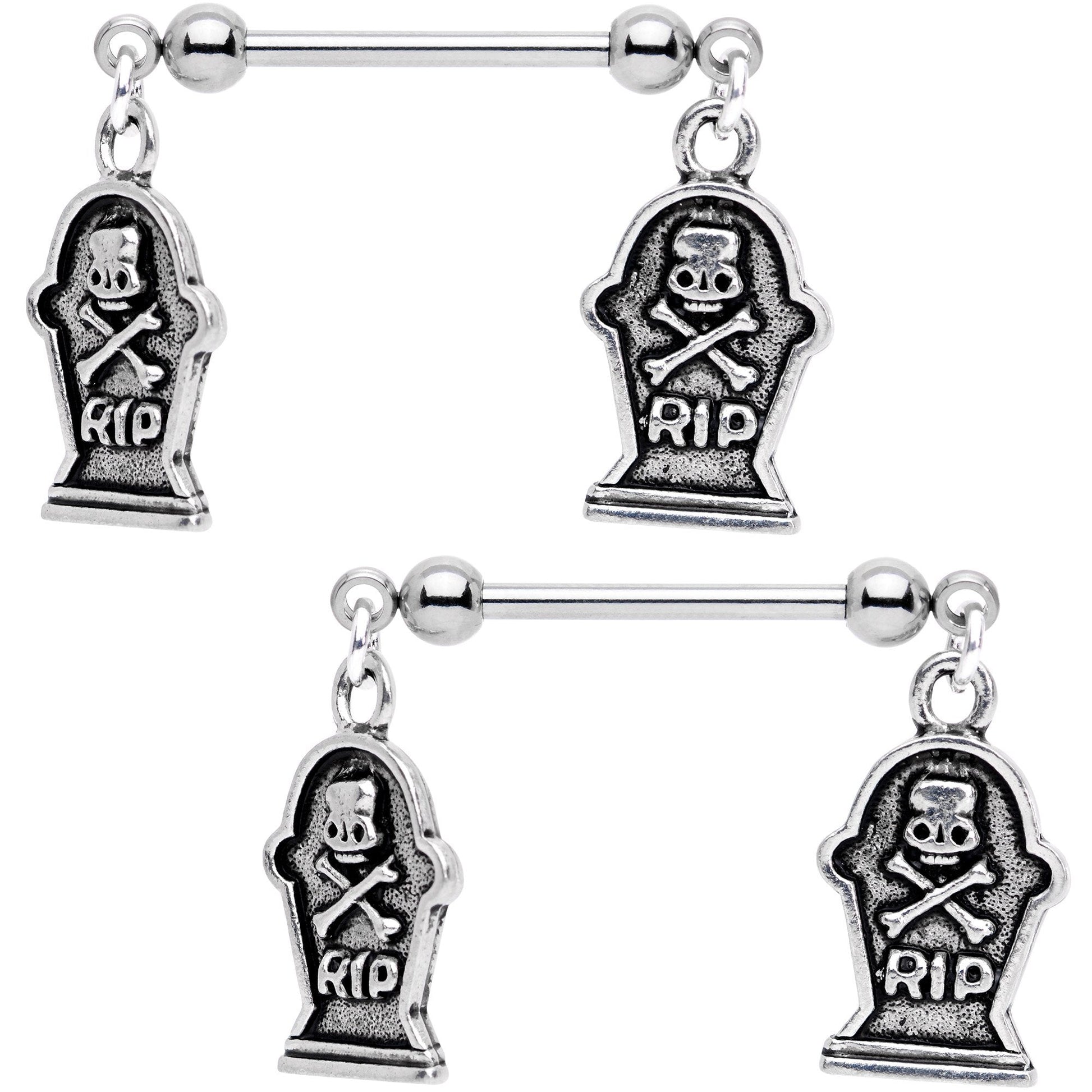 It's the season of spooky! The day of the dead! The season that needs no other reason than fall and fun; Halloween has come! This pair of skull and gravestone nipple piercings is made with 16mm durable 316L surgical grade stainless steel straight barbells and features grave stone dangle charms with skulls and "RIP." This fun set of Halloween nipple jewelry is sold as a set of two for you and is handmade in the USA.