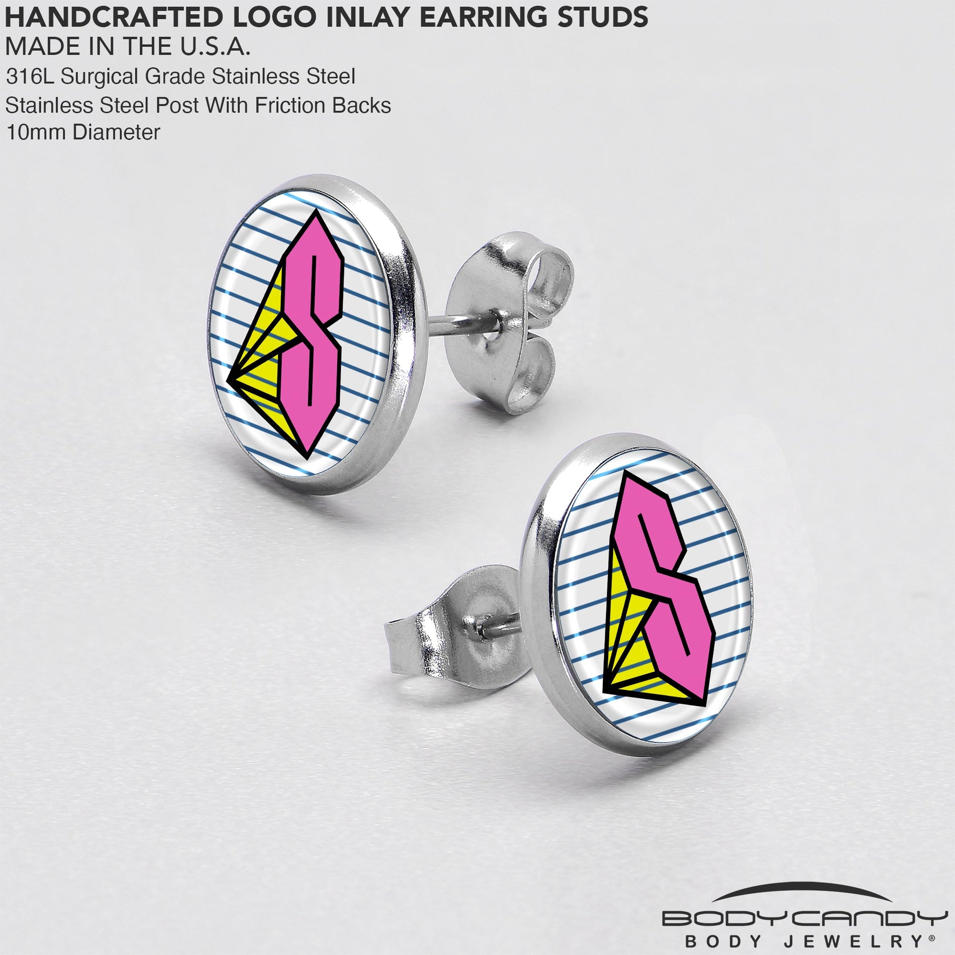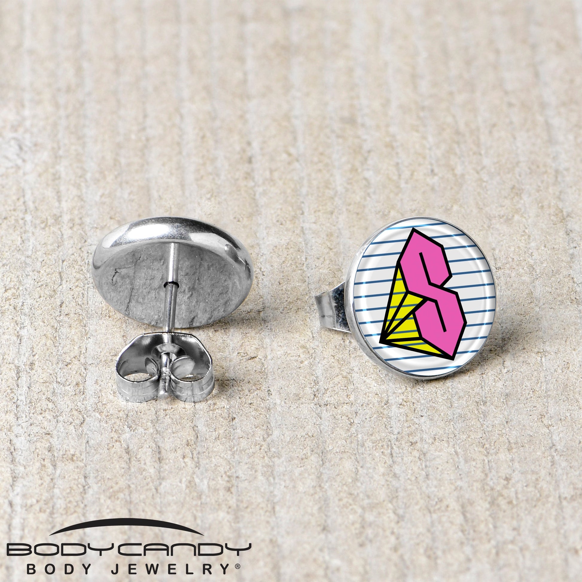 Get some retro school style with these throwback S stud earrings for pierced lobes. They're made with stainless steel straight posts with friction backs for a secure fit. Each one features a striped, white disc logo charm that resembles a piece of notebook paper. In the center is a hot pink S, stylized like the one everyone used to draw in their school notebooks, and embellished with yellow detailing. Take your look back to school with these retro pierced earrings. Sold as a set of two.