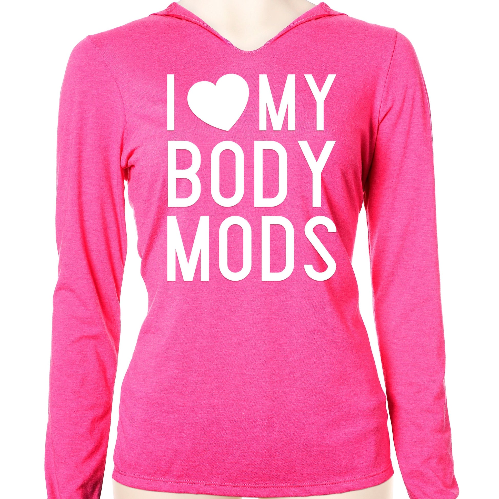 Let the world know that you Love your body mods whenever you wear Body Candy's 50/25/25 poly/ring spun combed cotton and rayon "I Love My Body Mods" v-neck hoodie. This soft and comfortable hoodie features shoulder to shoulder taping, a split v-neck with raw edge, and has a fitted style and is lightweight that is the perfect fusion of lightweight comfort and carefree style, combined into this fashionable pullover hoodie for women. The tri-blend fabric features colors that have a unique character and may have subtle variations in color.