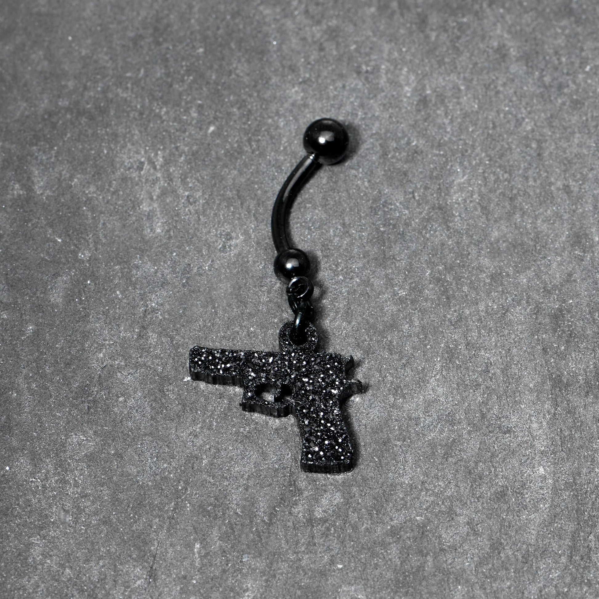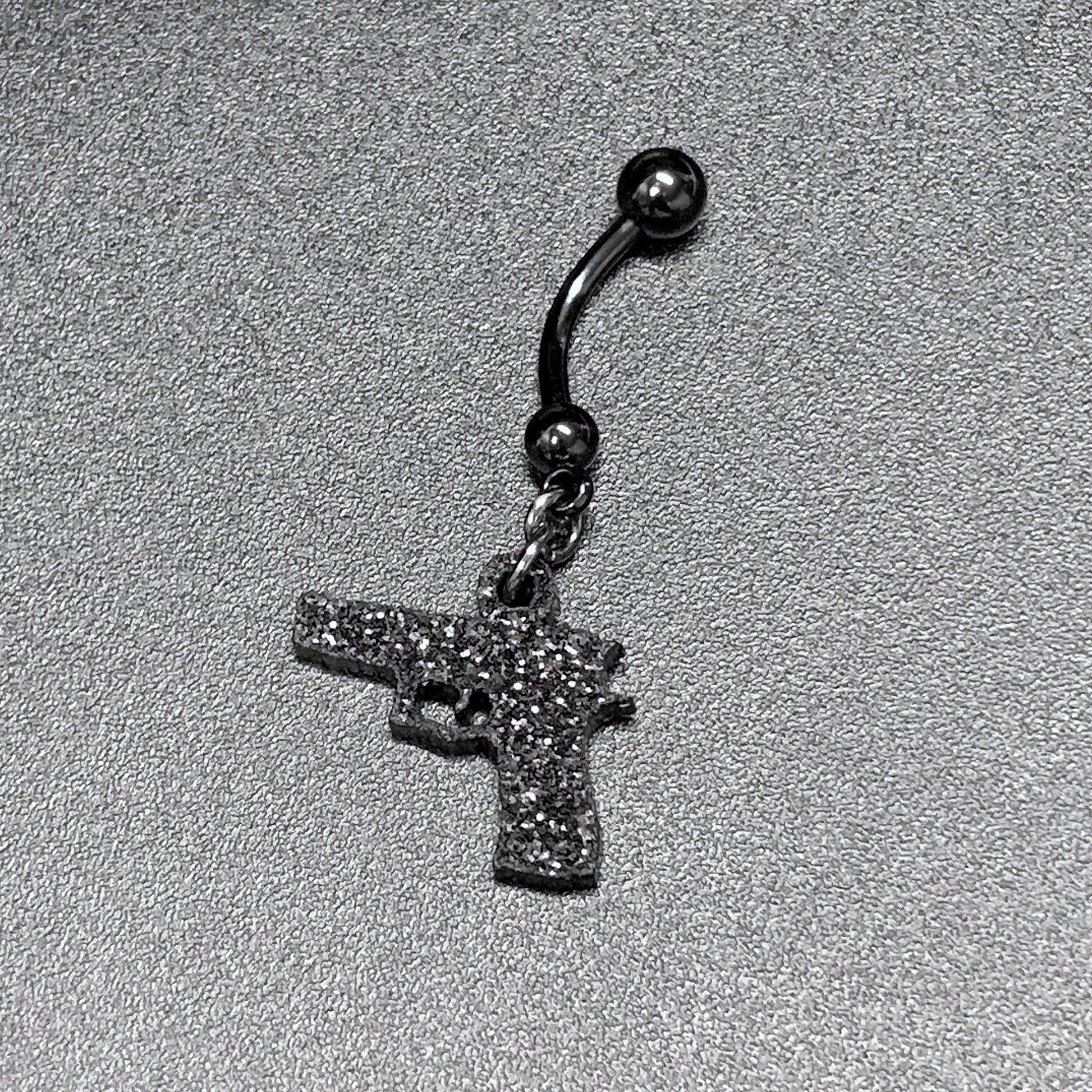 The compliments will be triggered with this sparkly glitter handgun belly ring. This surgical steel belly ring features a glitter dangle. Black glitter navel ring Body Jewelry./font>