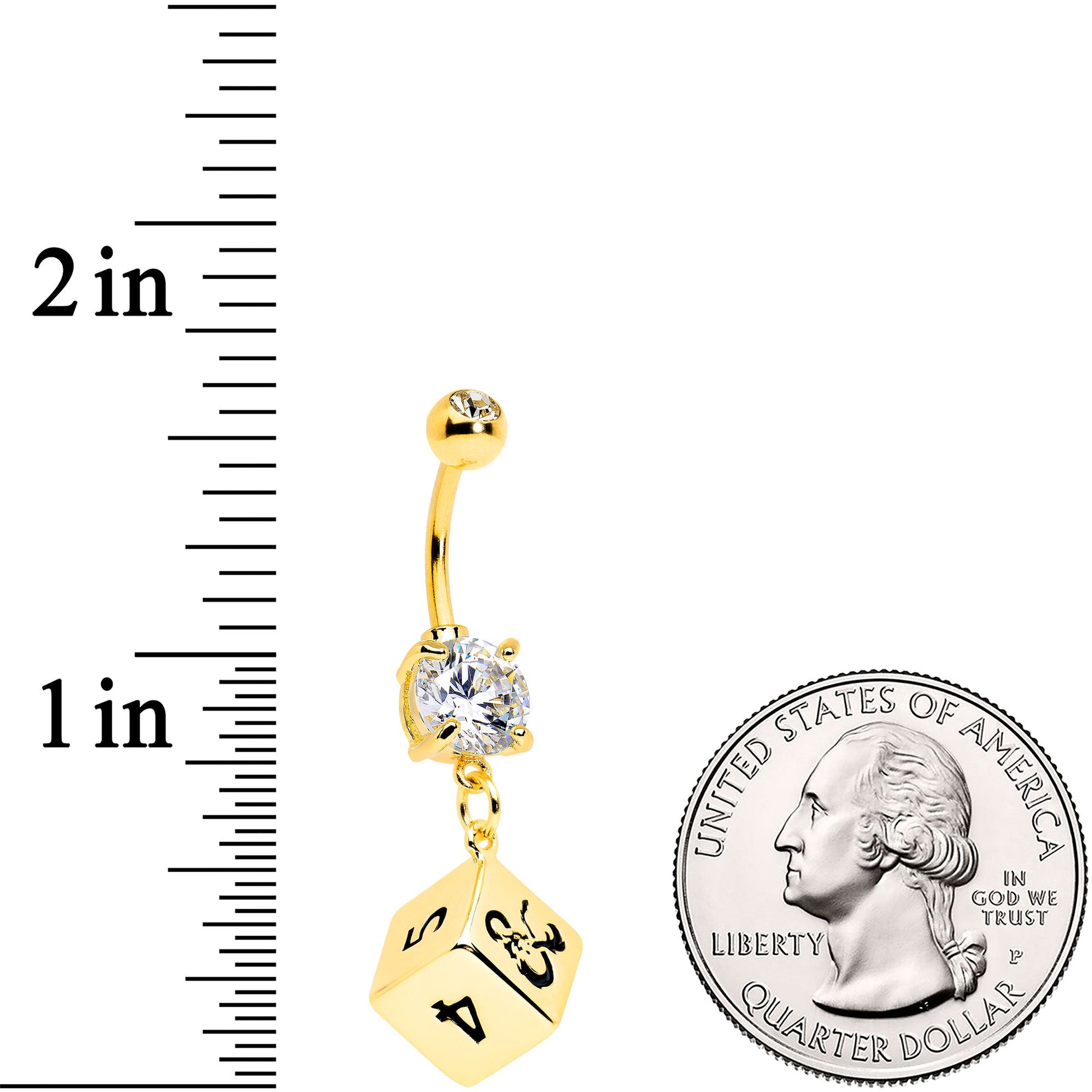 No need to roll for style points when you're rocking this 14 gauge navel ring! This officially licensed Dungeons & Dragons navel jewelry is made with a 3/8" gold tone PVD over 316L surgical grade stainless steel curved barbell. It has a 5mm top ball end, which is set with a clear cubic zirconia gem. The bottom end is a single clear cubic zirconia gem. Dangling beneath it is a matching polyhedral dice charm, featuring the official D&D ampersand. You'll be ready to take on any class of monster and look great doing it with this Dungeons and Dragons belly piercing ring!Specifications