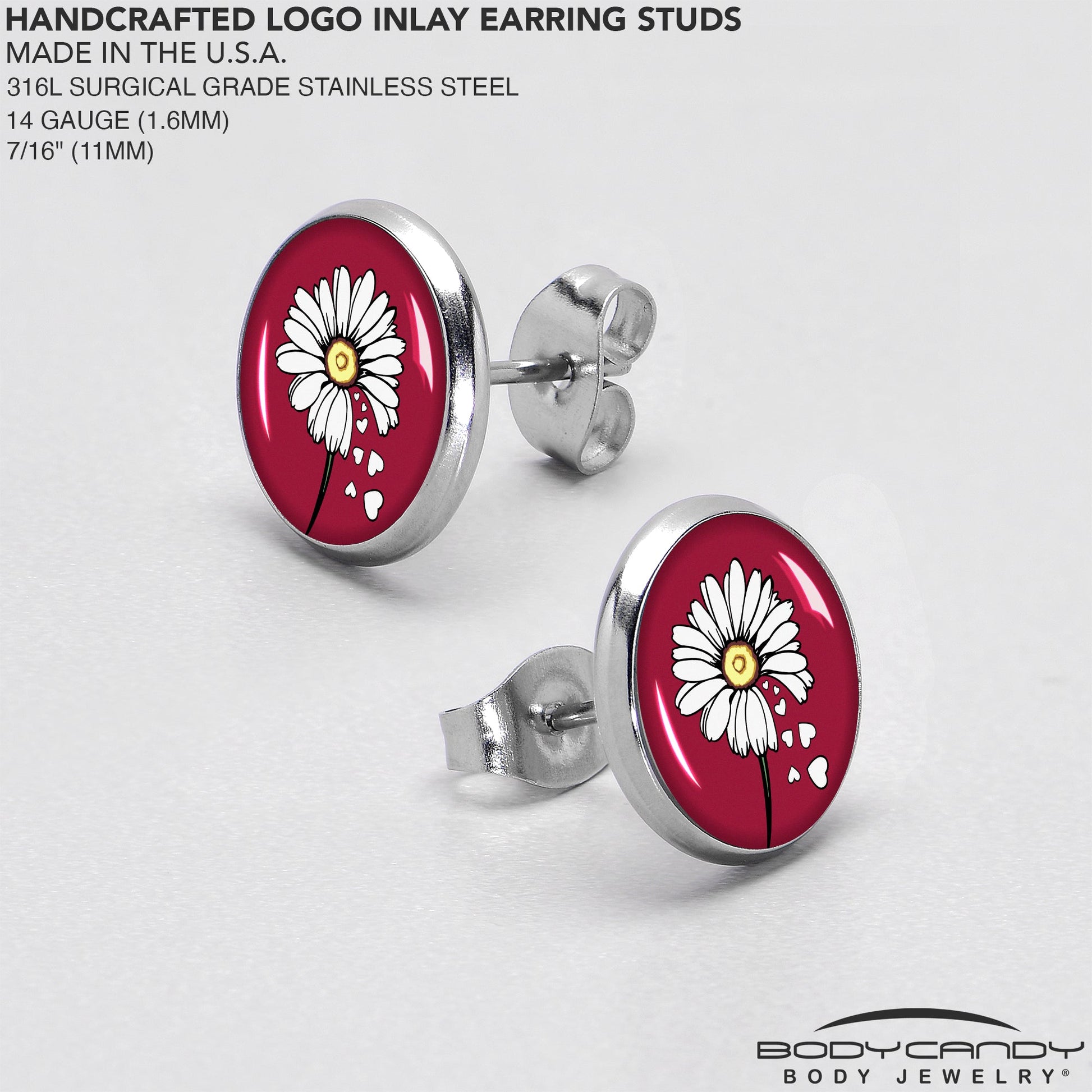 Everyone will love you when you are rocking these stud earrings for pierced ears. They are made with stainless steel straight posts with friction backs for a secure fit. Each one features a disc logo in deep red and shows a daisy flower in white and yellow. The flowers are shedding a portion of their petals, which have turned into tiny hearts. You will be winning hearts everywhere you go when you are flaunting these fabulous floral pierced earrings. Sold as a set of two.