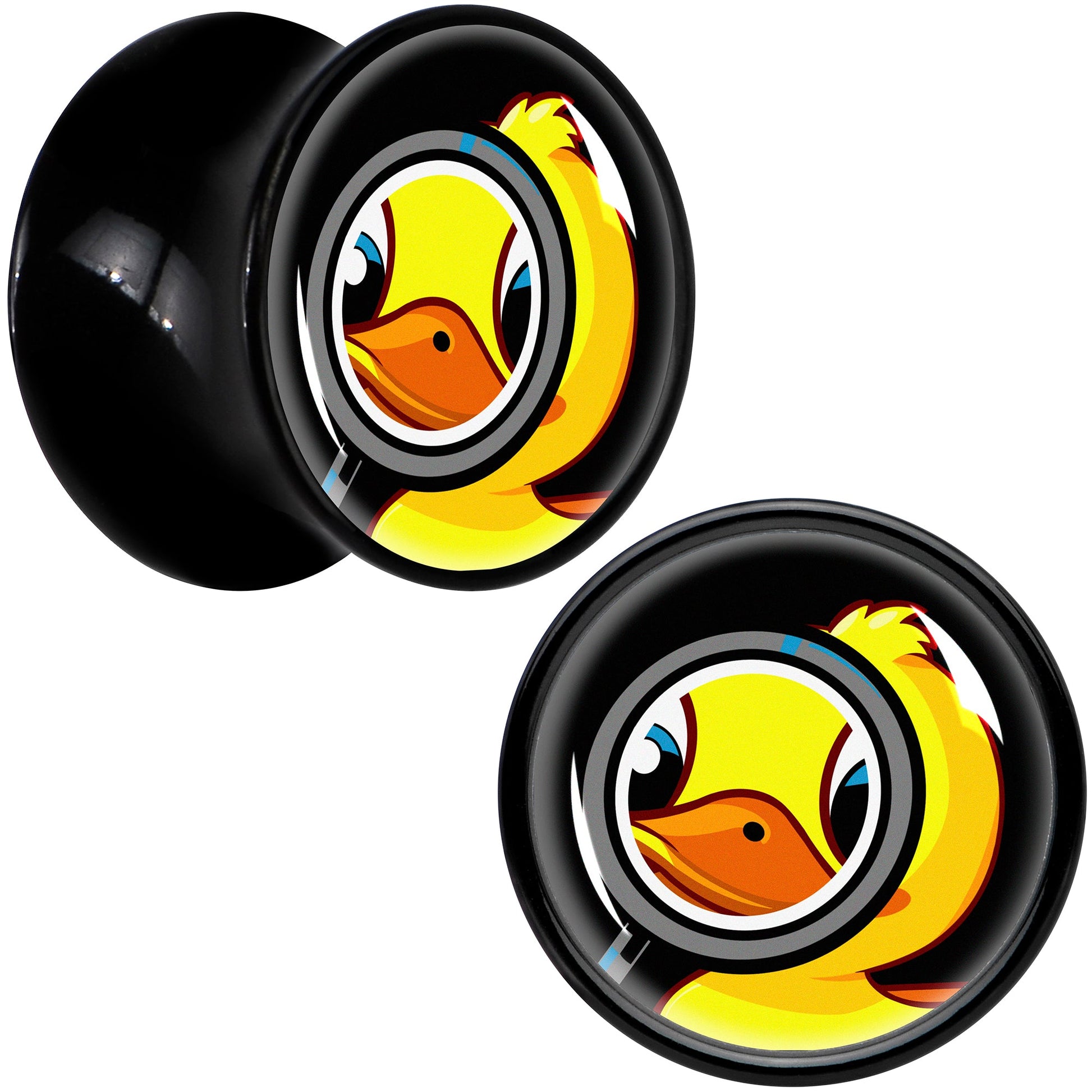 Take a closer look at style with the detective duck on these plug earrings for stretched lobes. They're made with black acrylic and feature a saddle design for comfortable insertion and removal. Each one features a yellow duck charm. The duck appears to be getting a closeup with its magnifying glass. You'll have your own private duck with these delightfully unique detective duck ear gauges. Sold as a set of two. Available in Sizes 8mm to 20mm.