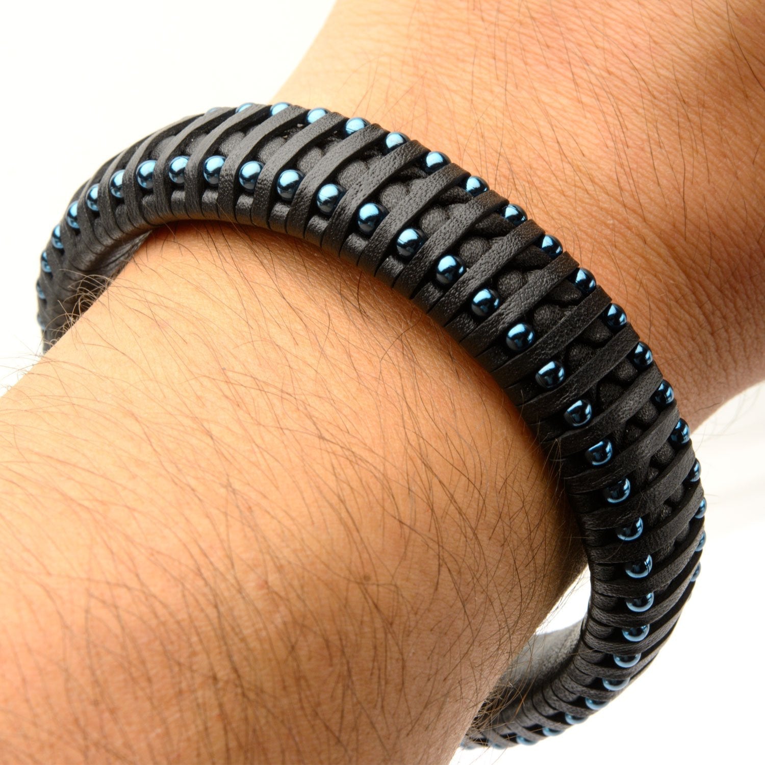 Men's 6mm black leather bracelet featuring two rows of blue IP over stainless steel ball edges.
