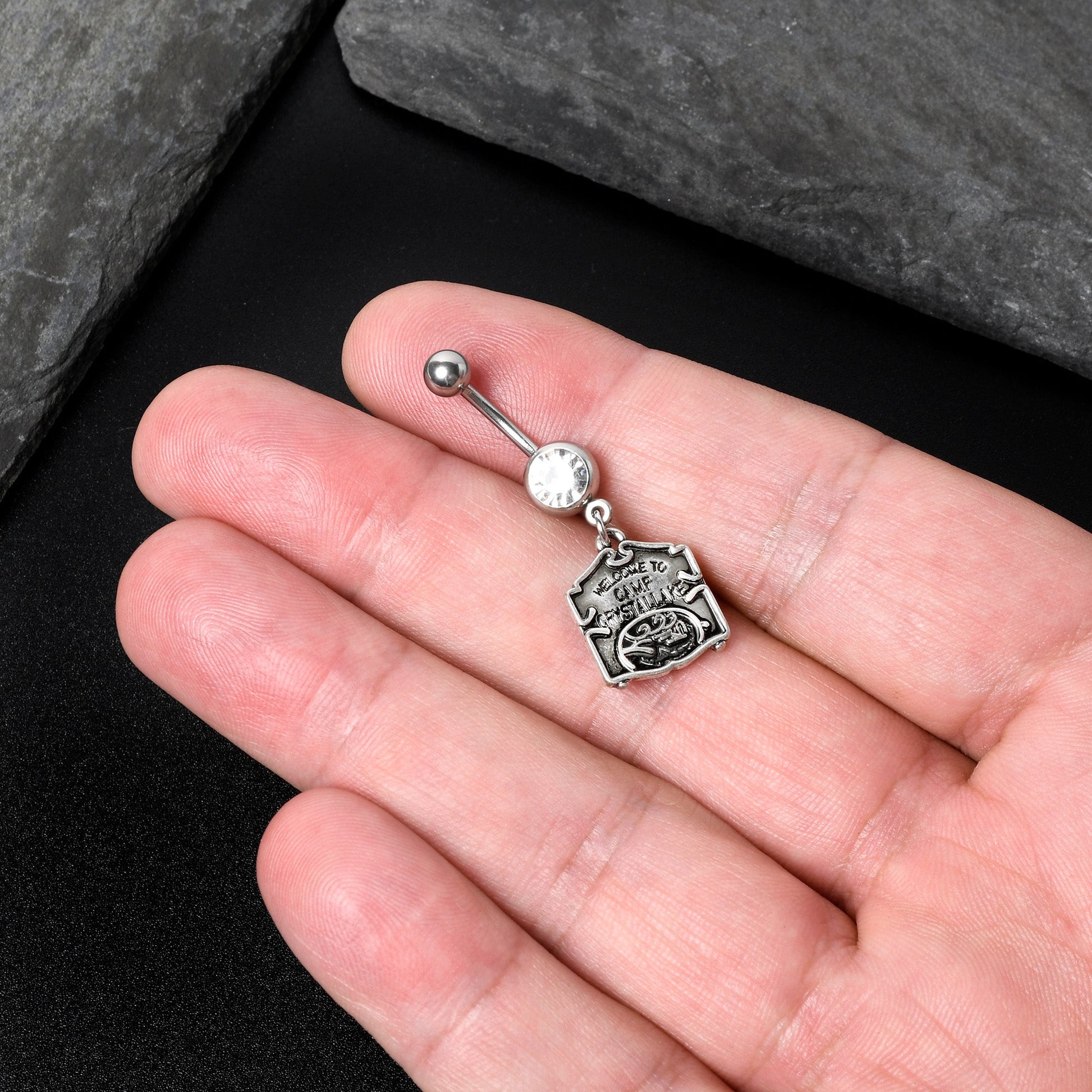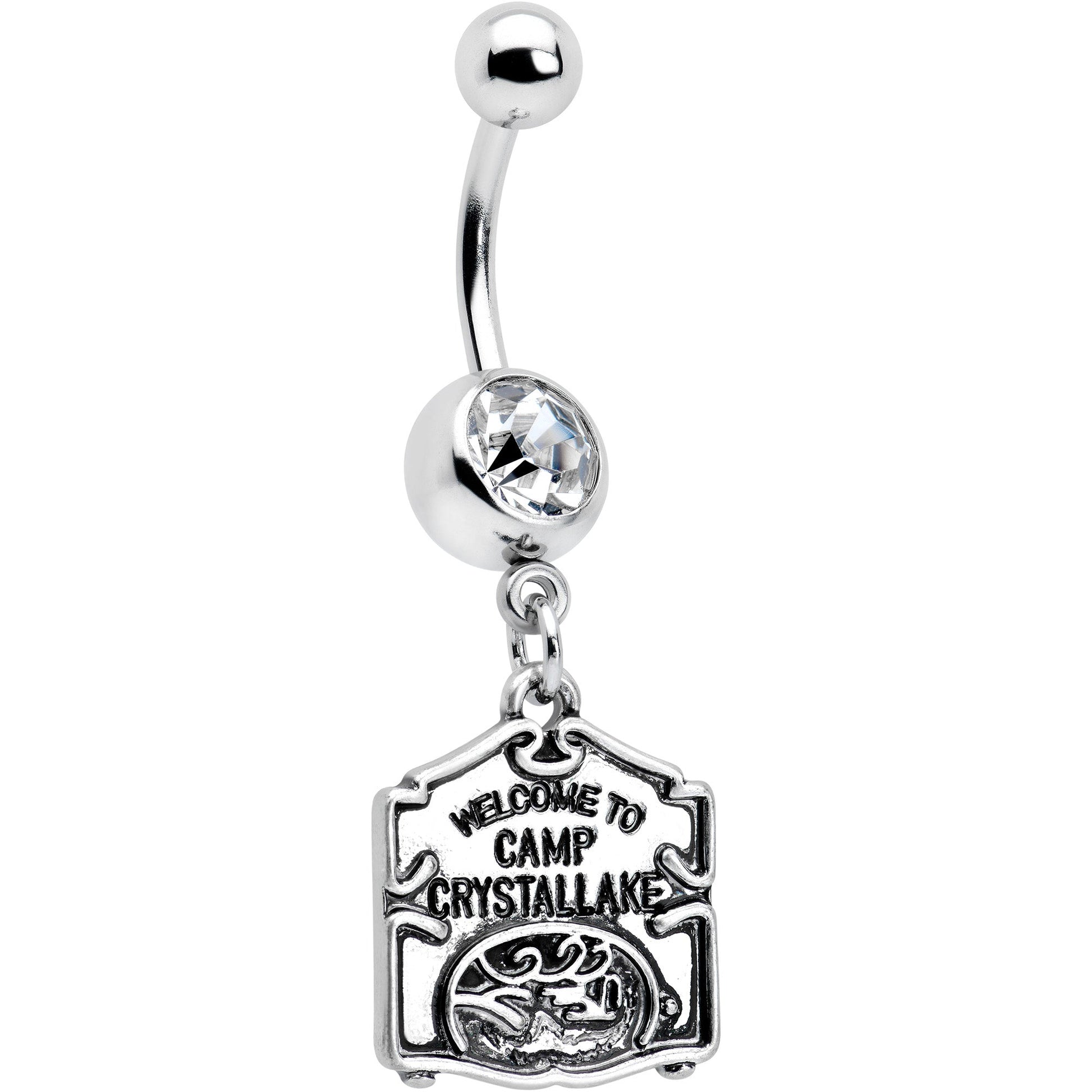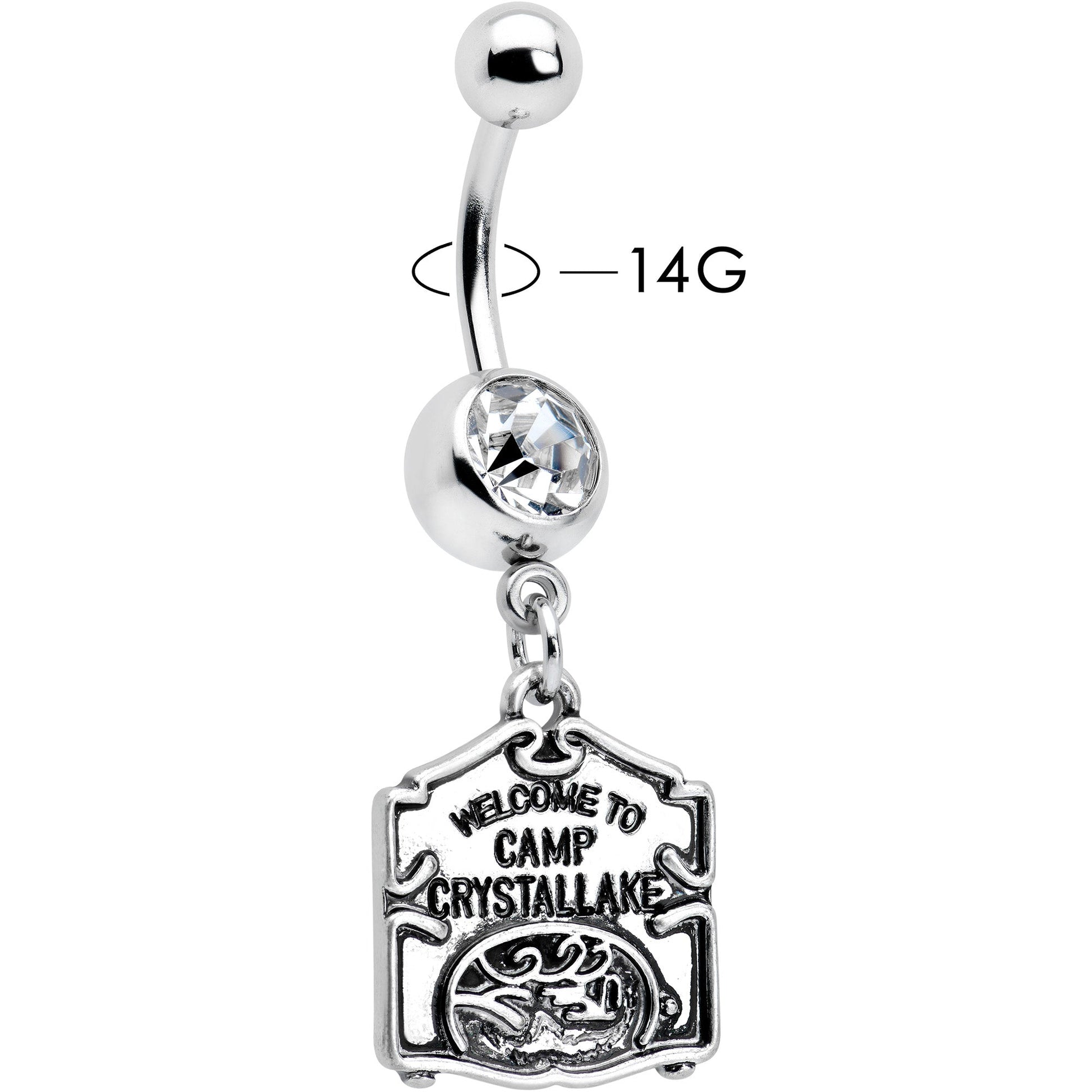 If you're way into horror, give everyone a sign with this officially licensed 14 gauge navel ring! It's made with a 3/8" durable 316L surgical grade stainless steel curved barbell with a 5mm top ball end. The bottom ball end is 8mm and set with a large clear gem. Dangling beneath it is the official Welcome to Camp Crystal Lake sign charm. It replicates the actual movie sign to degree that's downright scary! You may be able to run, but you can't hide from style with this creepy cool officially licensed Friday the 13th belly piercing ring!Specifications
