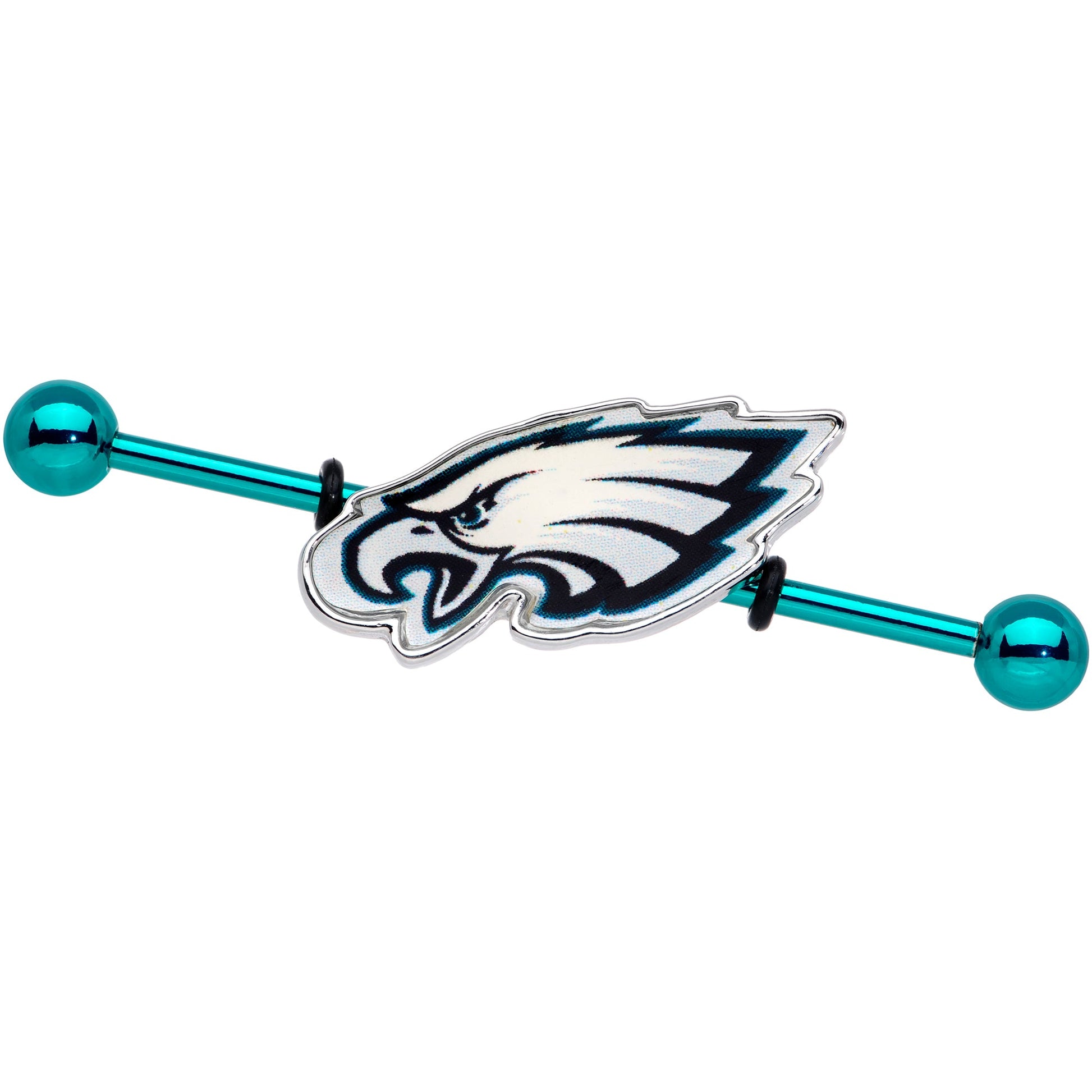 Show off team pride with an officially licensed NFL Philadelphia Eagles pierced industrial barbell. The iconic green and white Eagles logo sits atop a green anodized titanium over stainless steel 14 gauge, 38mm project barbell. Helix project bar works for multiple piercings and comes with rubber O-rings to hold moveable charm in place. National Football League logo Body Jewelry.