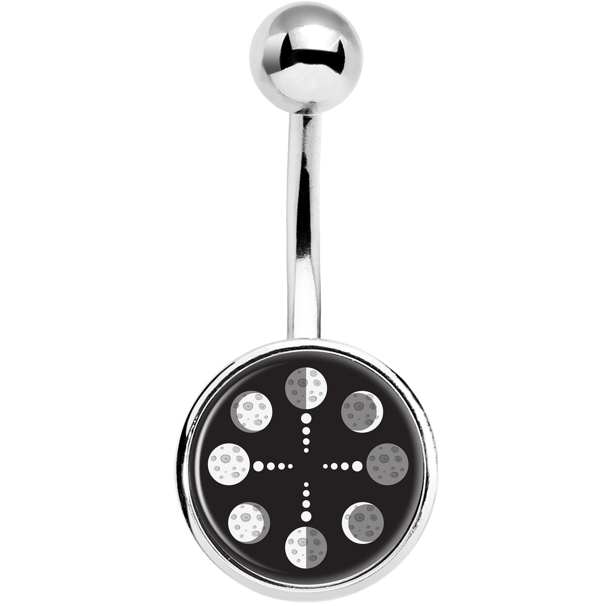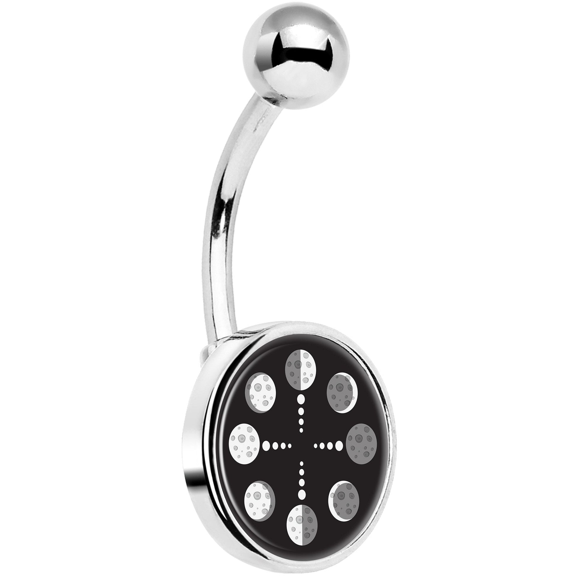 If you are interested in tracking the lunar cycle and celebrating the goddess of the night sky then this navel jewelry is right for you! Made with a 7/16" durable 316L surgical grade stainless steel curved barbell, this belly button ring features the phases of the moon on a black background logo inlay.Specifications