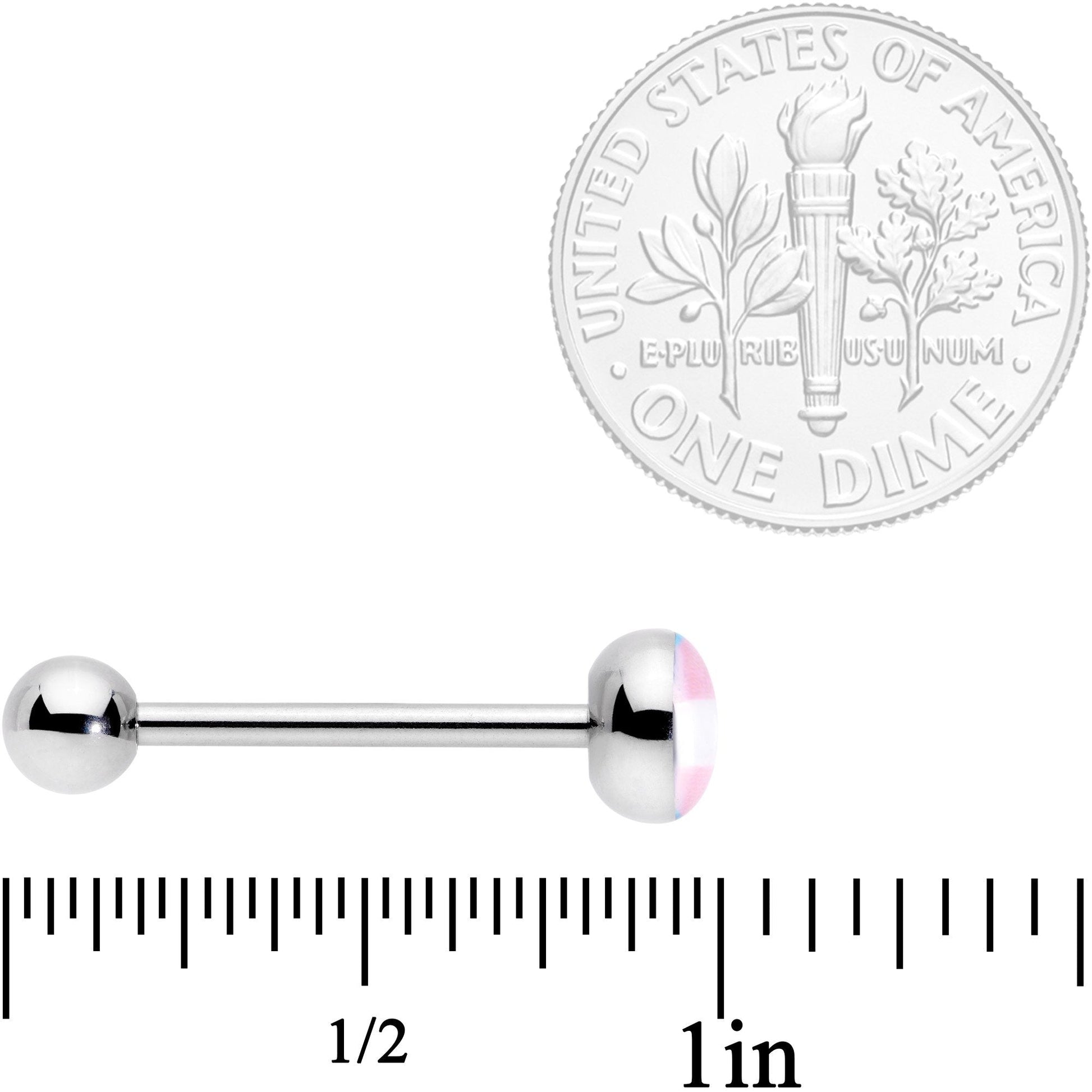 Show off your belief in transgender rights when you wear this 14 gauge tongue piercing. Made with a 5/8" durable 316L surgical grade stainless straight barbell, this tongue jewelry features a transgender pride flag top inlay in pink, white, and blue so you can show your support for all people no matter how they identify.Specifications