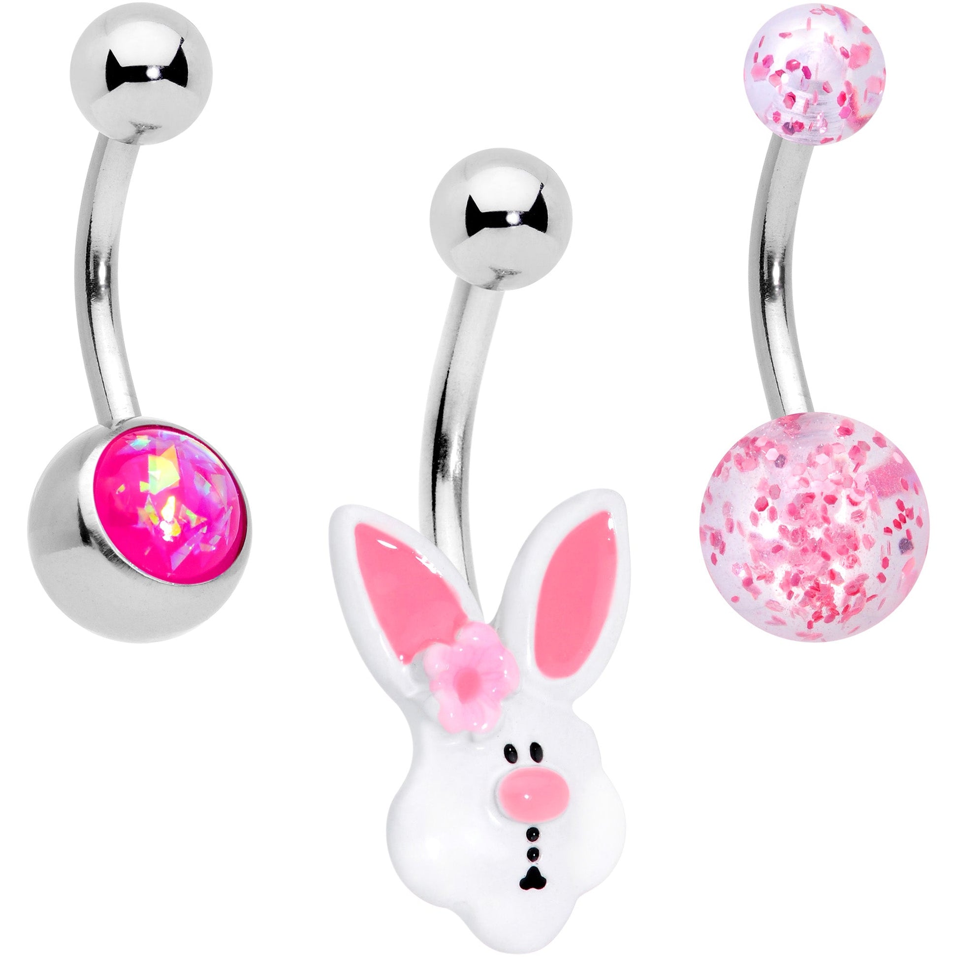 Get things hopping this spring with this Easter-themed set of 14 gauge navel rings! They're made with 3/8" durable 316L surgical grade stainless steel curved barbell. The first features a 5mm top ball end and 8mm bottom ball end, both made with clear acrylic and full of pink flecks. The second features a plain 5mm top ball end and an 8mm bottom ball end that's set with a hot pink faux opal for a look that's colorful and super on-trend. The third features a plain 5mm top ball end and the bottom end is a charm of the Easter bunny! If you want your navel piercing to wear pretty pink this Easter, this set of belly button rings is an eggs-ellent way to go! Sold as a set of three.Specifications
