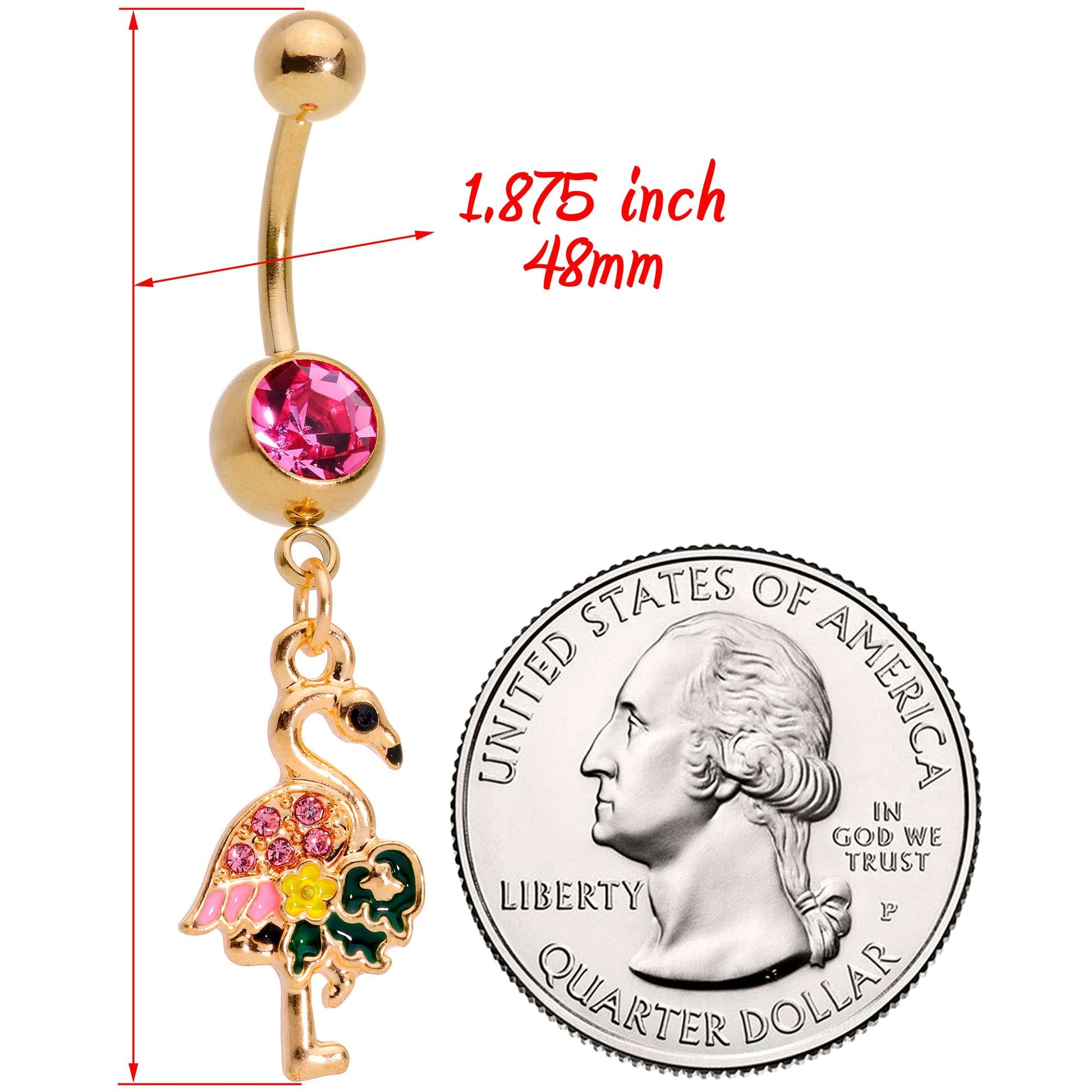 This is one flashy looking flamingo that you're going to love to flaunt whether you're from Florida or not! The 14 gauge navel ring is made with a 3/8" gold tone plated over 316L surgical grade stainless steel curved barbell with a 5mm top ball end. The 8mm bottom ball end is set with a large pink gem. Dangling from the bottom is a pink flamingo charm in a classic one-legged stance. The flamingo is set with dark pink gems along its back and has a black gem eye for a truly vibrant appearance. This belly button ring is ideal for warm weather - when you look this bright and colorful you can't help but want to show it off!
