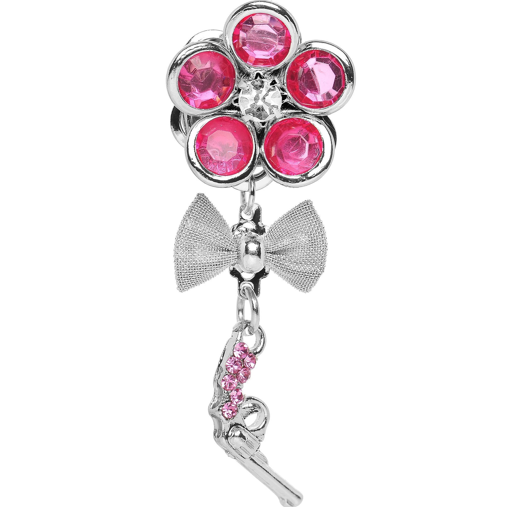 Sold individually, purchase 2 for a pair. Ear expander plug. Flower plug body jewelry with sparkling center gem. Stainless steel hollow tunnel ear plug fashioned with mesh bow and an jewel paved handgun charm. Dangle charm ear plug.