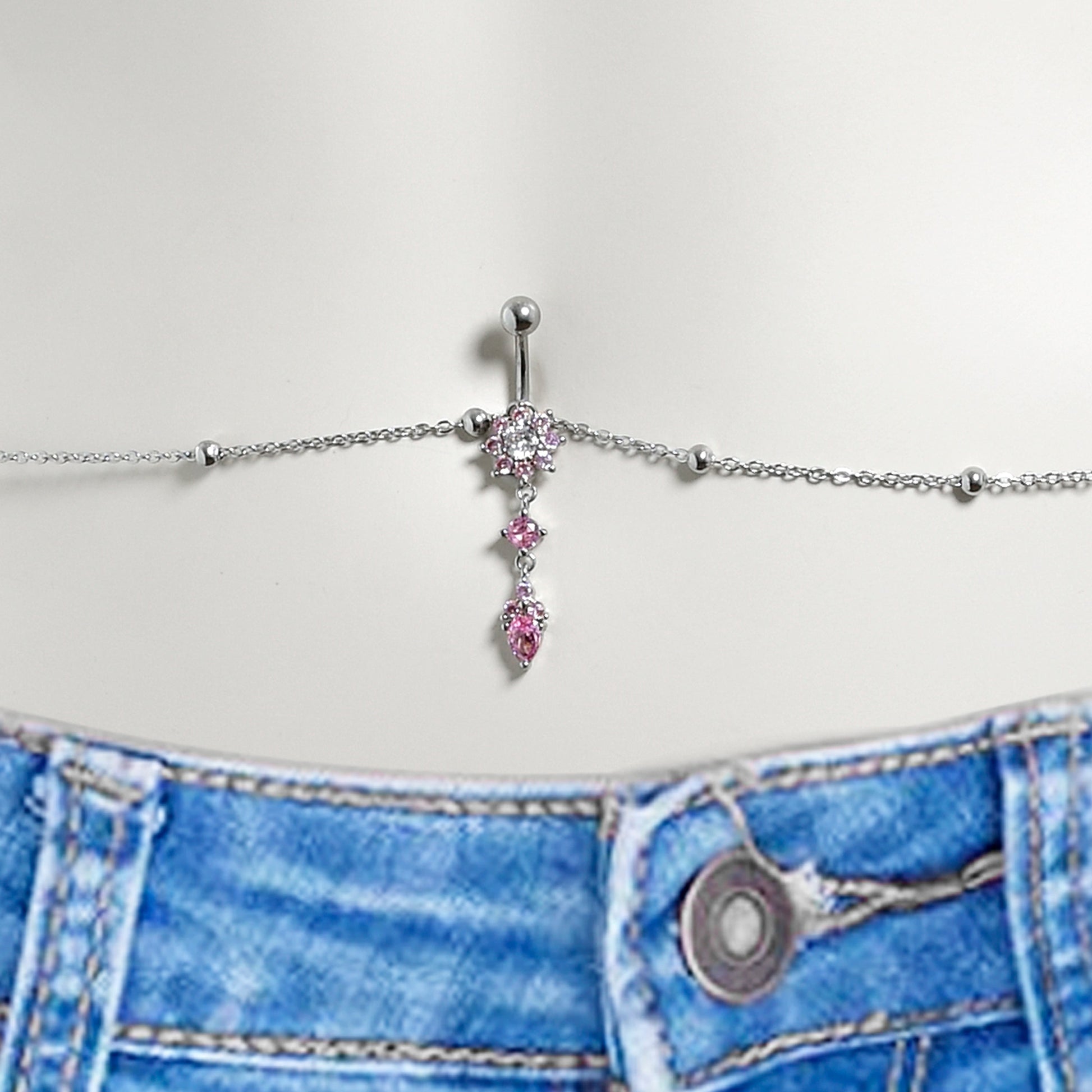 Don't let your midriff go bare when you wear your favorite halter top or belly shirt. This sexy belly chain jewelry is attached to a 14 gauge navel ring made with a 3/8 inch 316L surgical grade stainless steel curved barbell with a 5mm top ball end. The bottom end features a rich paved pink gem charm. dangling beneath are two more gems in a deeper pink. This belly piercing jewelry features a 29.5 inch length waist belt with a 2 inch extension. The waist chain features a lobster clasp used to adjust the length to fit your body.Specifications