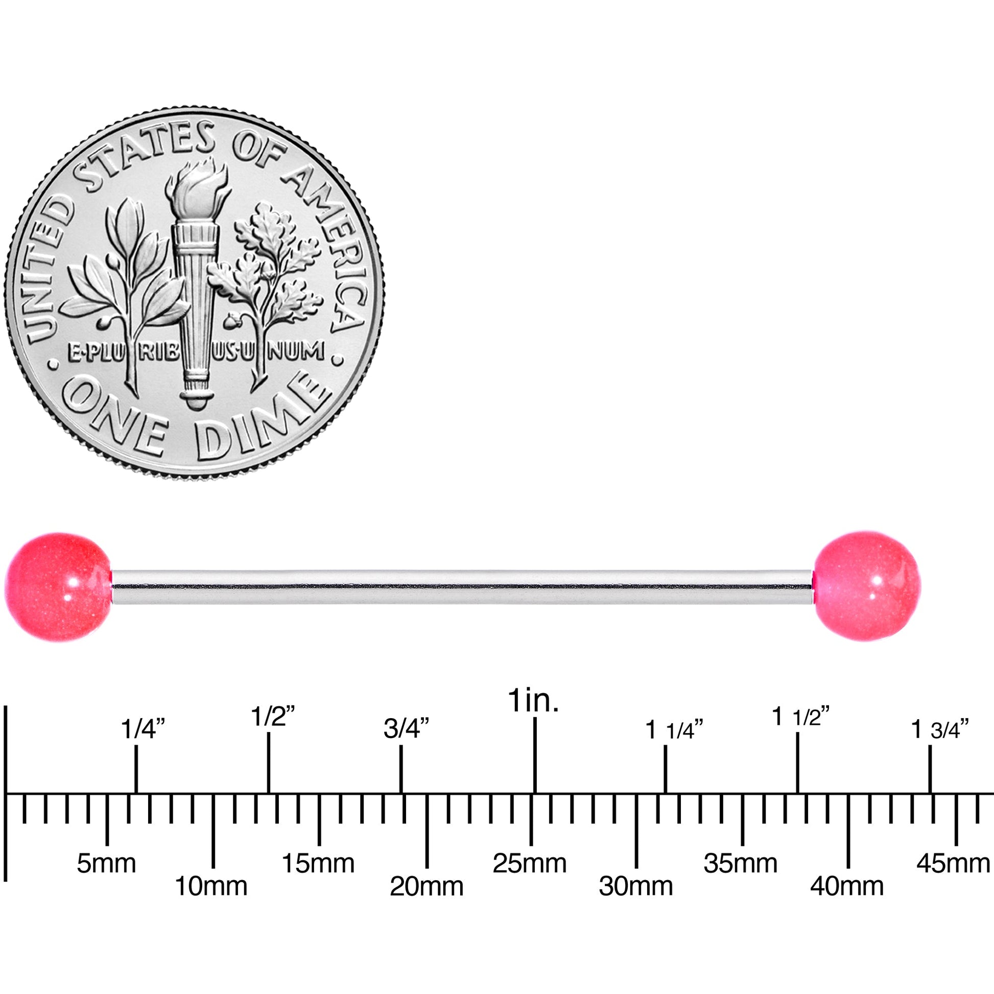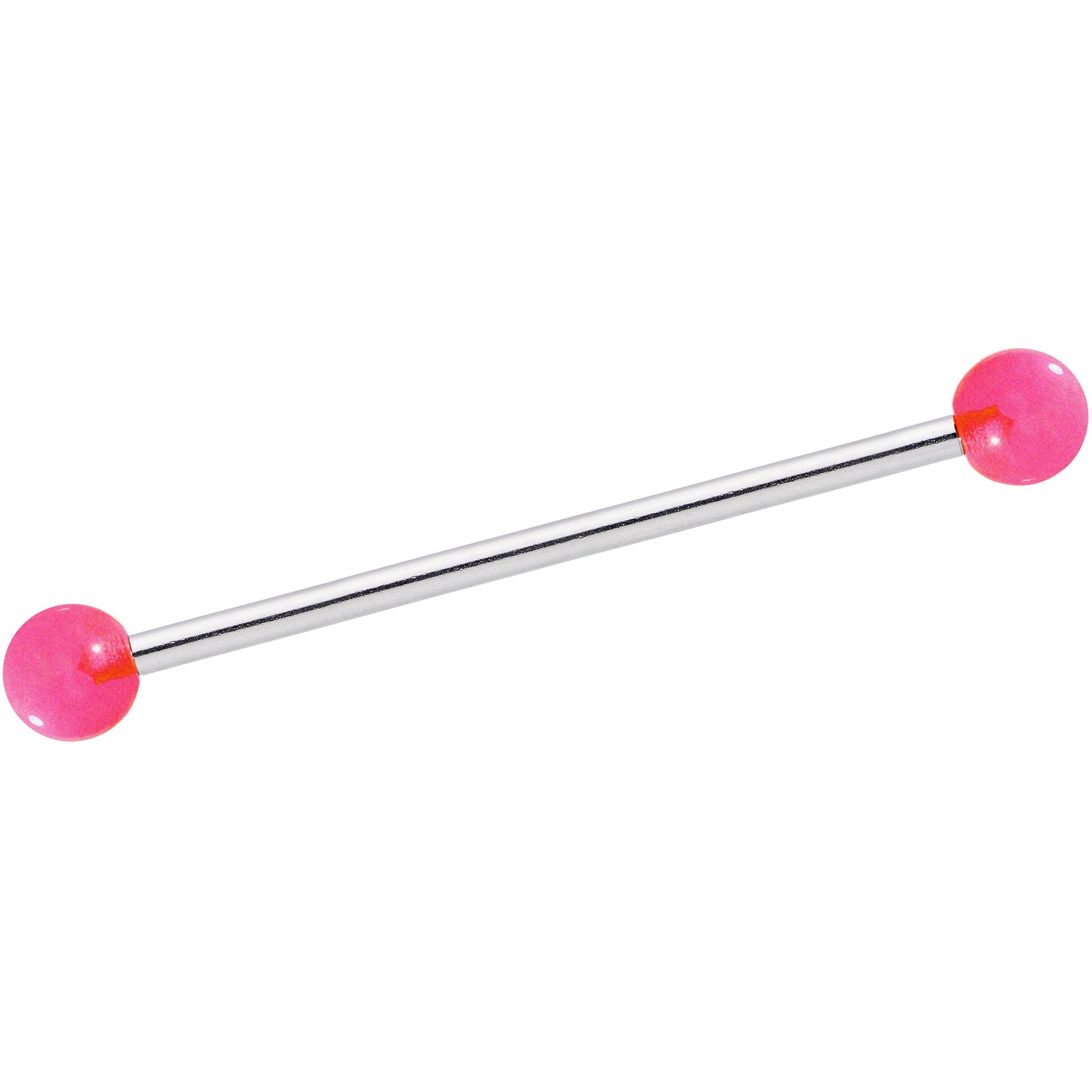 Glow in the dark industrial barbell. 14 Gauge surgical steel straight industrial barbell with acrylic ball ends. Project bars work for multiple piercings. Simply insert each end of the barbell into each hole to wear piercing.