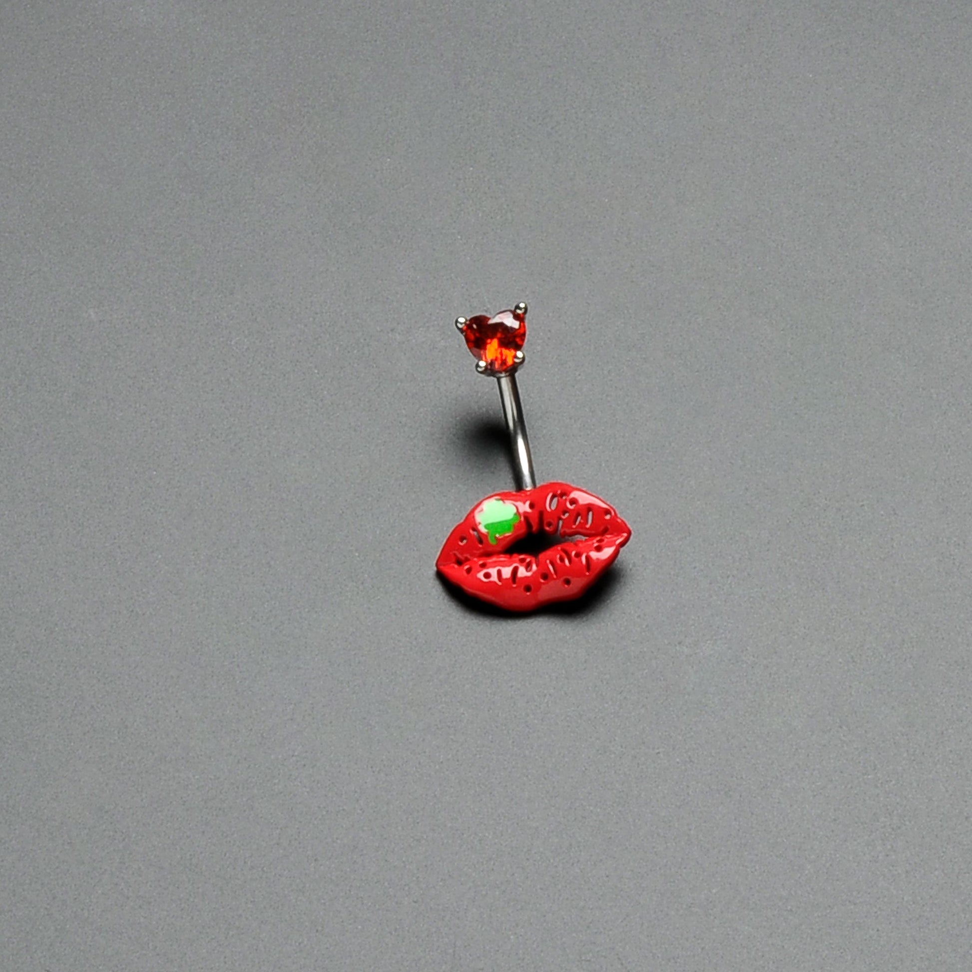 Get lucky this Saint Patrick's day with this 14 gauge navel ring! It's made with a 3/8" durable 316L surgical grade stainless steel curved barbell. The top end is a red heart-shaped cubic zirconia gem. The bottom end features a lips charm, with textured detailing. It's further embellished with a green shamrock detail. You'll feel lucky to have this in your navel piercing when you're rocking this St. Patrick's Day themed belly piercing ring!Specifications