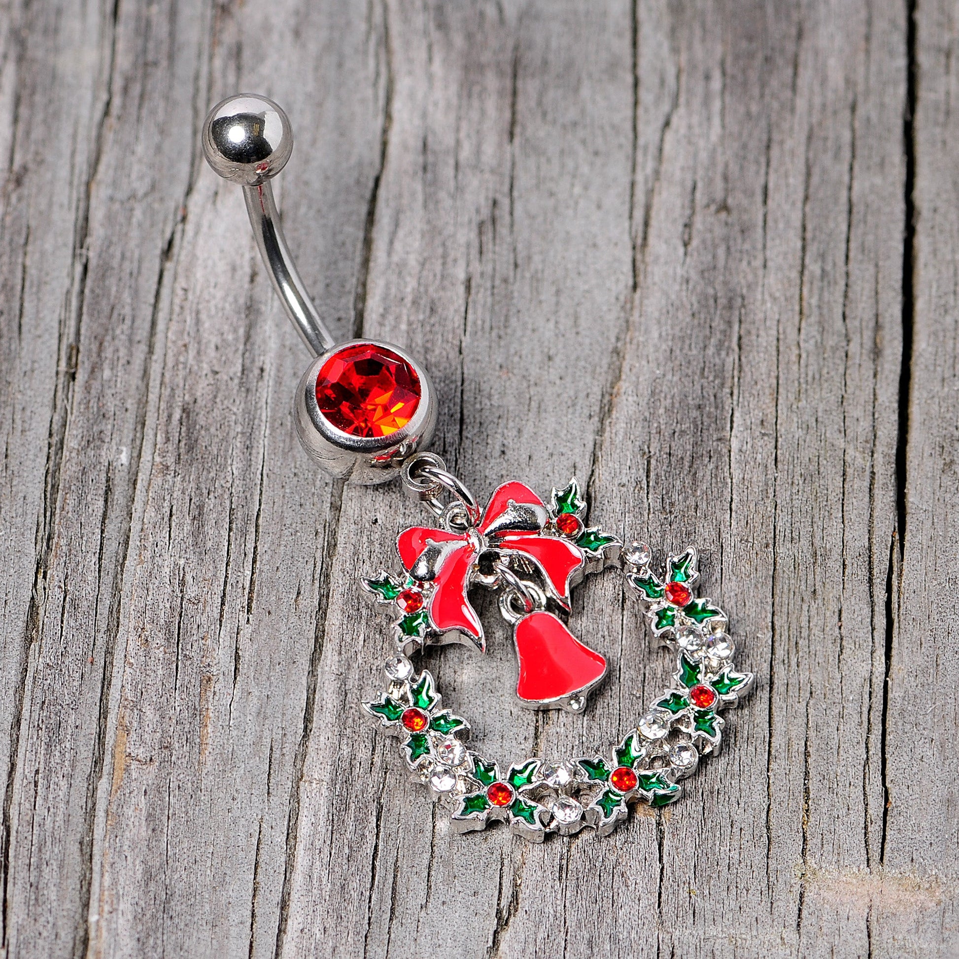 Red Gem Holiday Bell Wreath Christmas Dangle Belly Ring