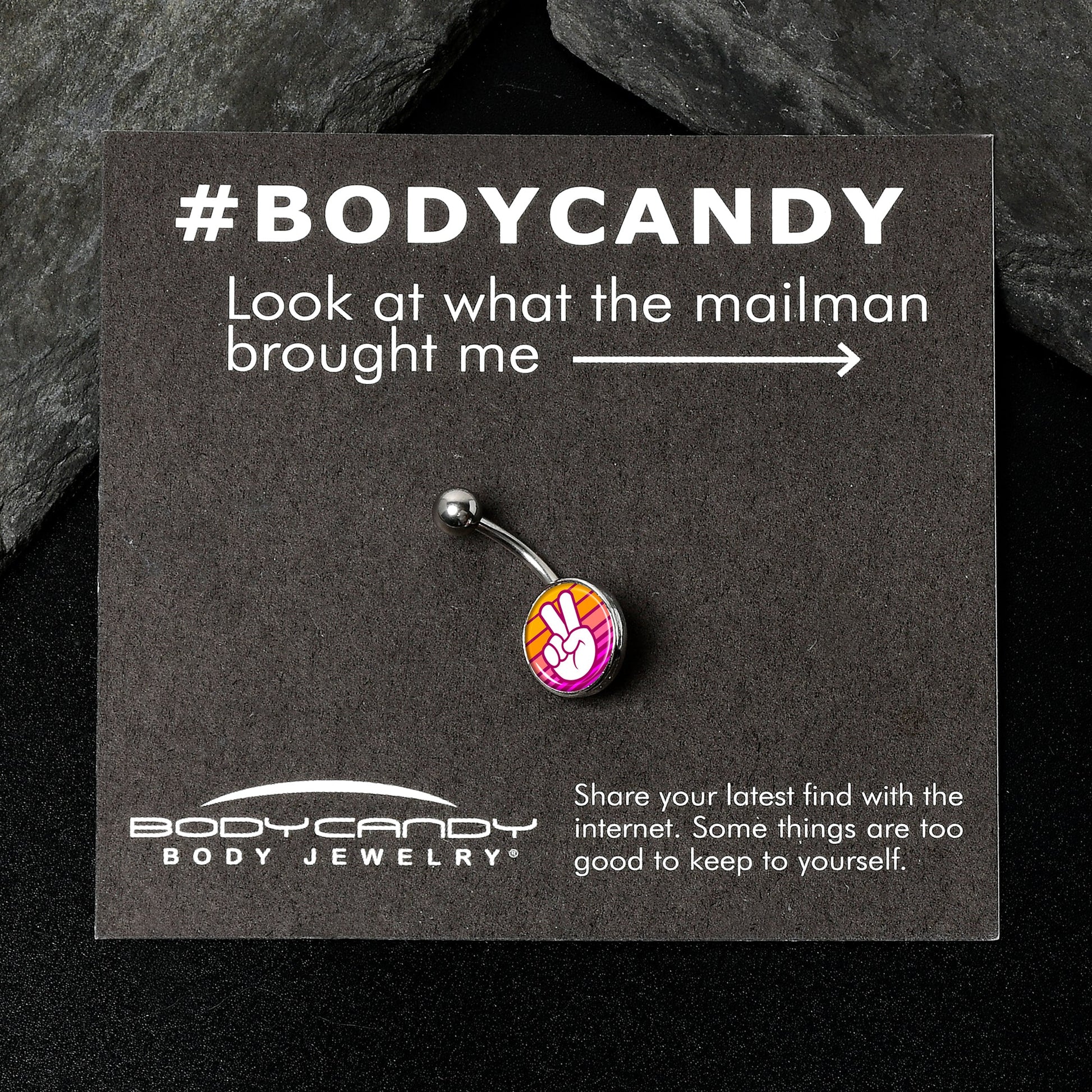 Let your belly piercing speak words of peace with this 14 gauge navel ring. It is made with a 7/16 inch durable 316L stainless steel curved barbell with a 5mm top ball end. The bottom end features a disc charm of a hand giving the classic peace sign from the 1960s. The hand is further embellished with a striped background that shades from purple to orange. You will be feeling the peace and love with this classic peace sign belly piercing ring.