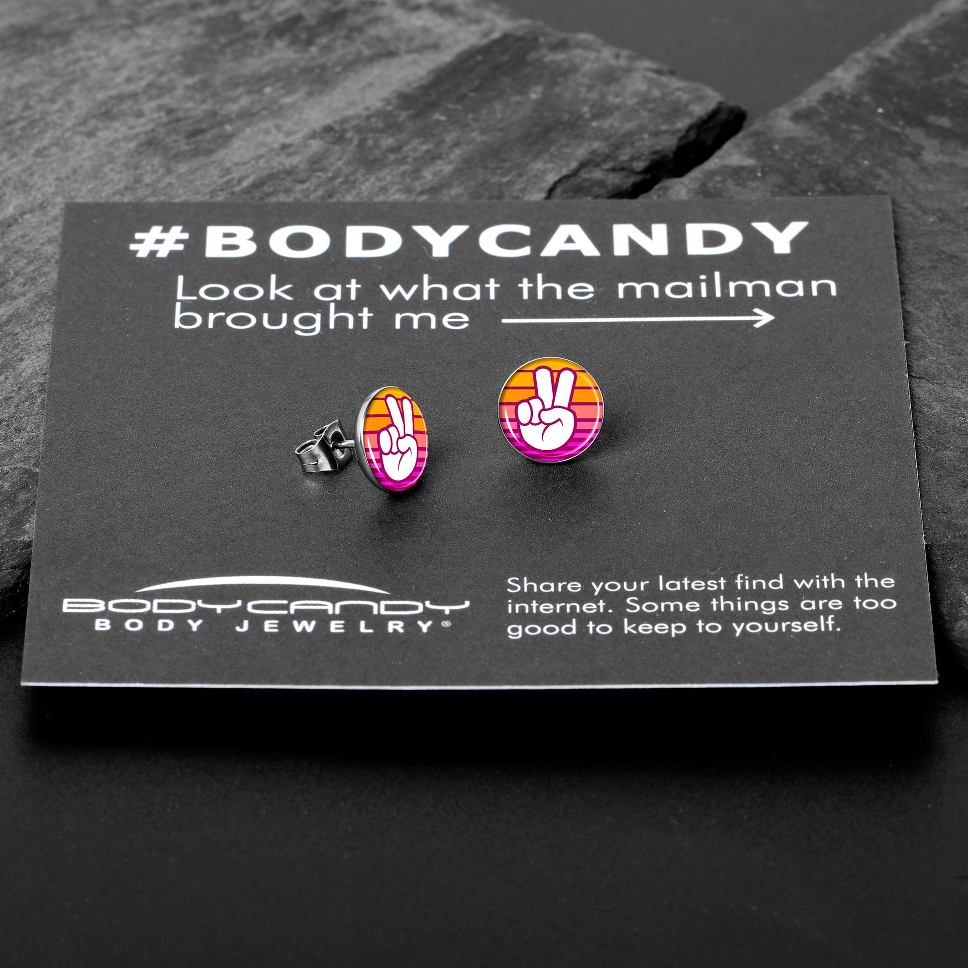 Let your lobes speak words of peace with these stud earrings for pierced ears. They are made with stainless steel straight posts with friction backs for a secure fit. They feature disc charms of a hand giving the classic peace sign from the 1960s. The hands are further embellished with a striped background that shades from purple to orange. You will be feeling the peace and love with these classic peace sign stud earrings. Sold as a set of two.