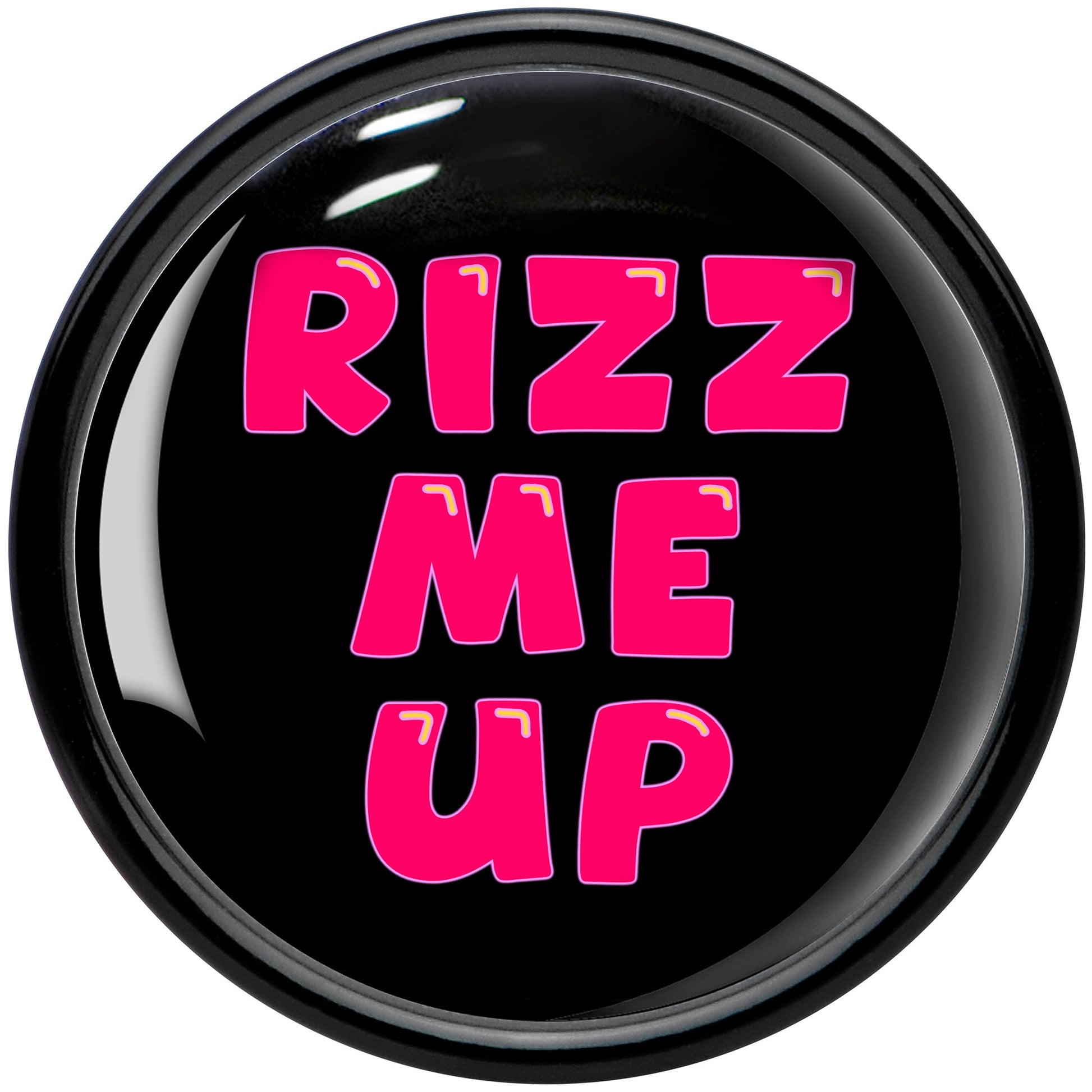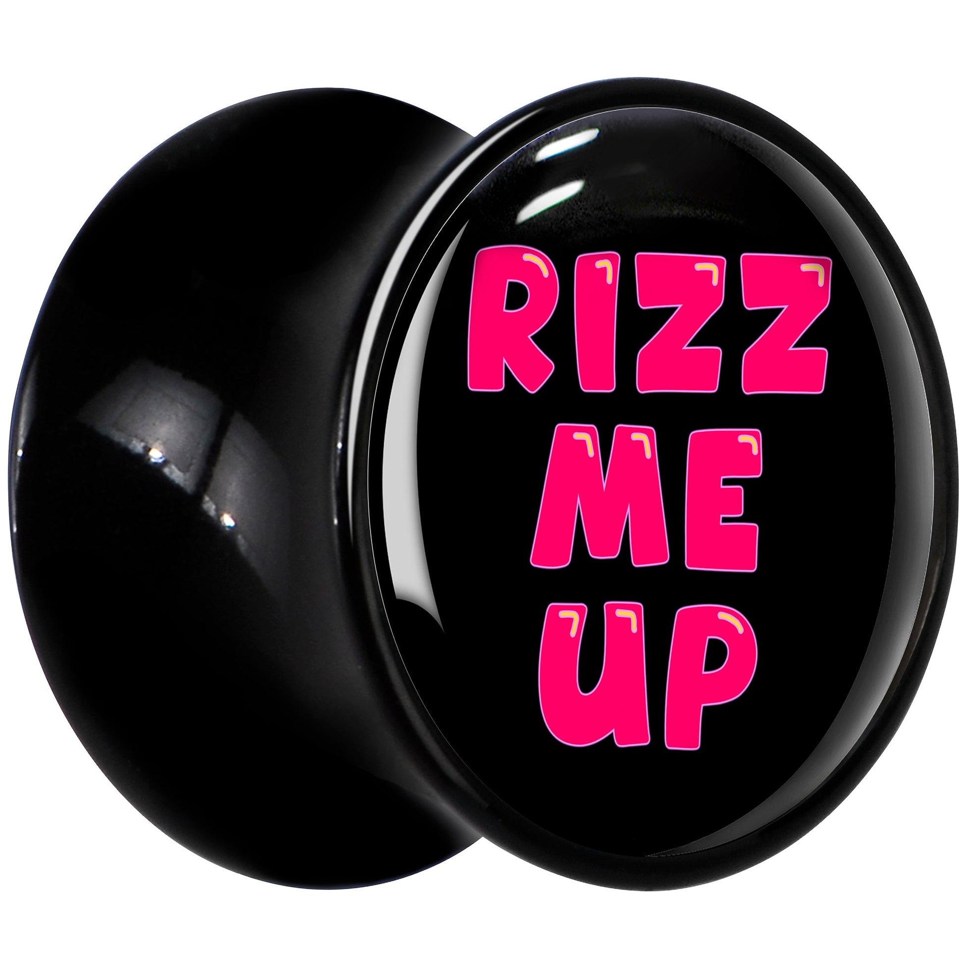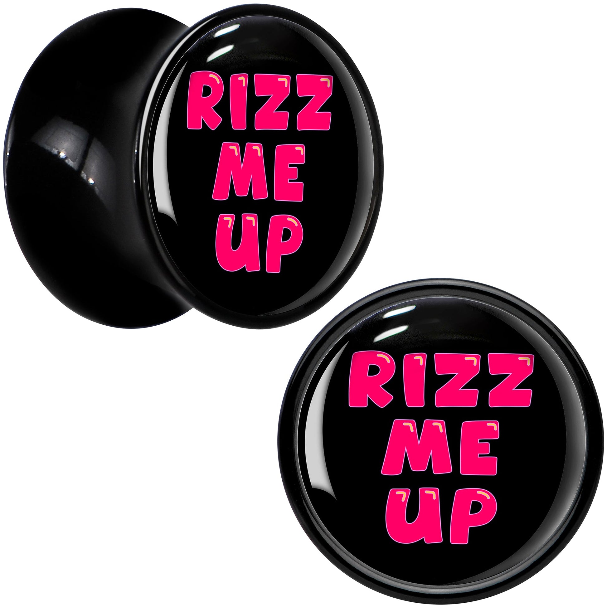 If you need a little rizz, let the world know with these saddle plugs for stretched lobes. They're made with black acrylic with a saddle design for comfortable insertion and removal. Each one features a logo inlay with the words rizz me up in a slick looking font that is sure to get noticed. Express your needs and get seen with these ear gauges which are full of charisma on their own. Sold as a set of two.