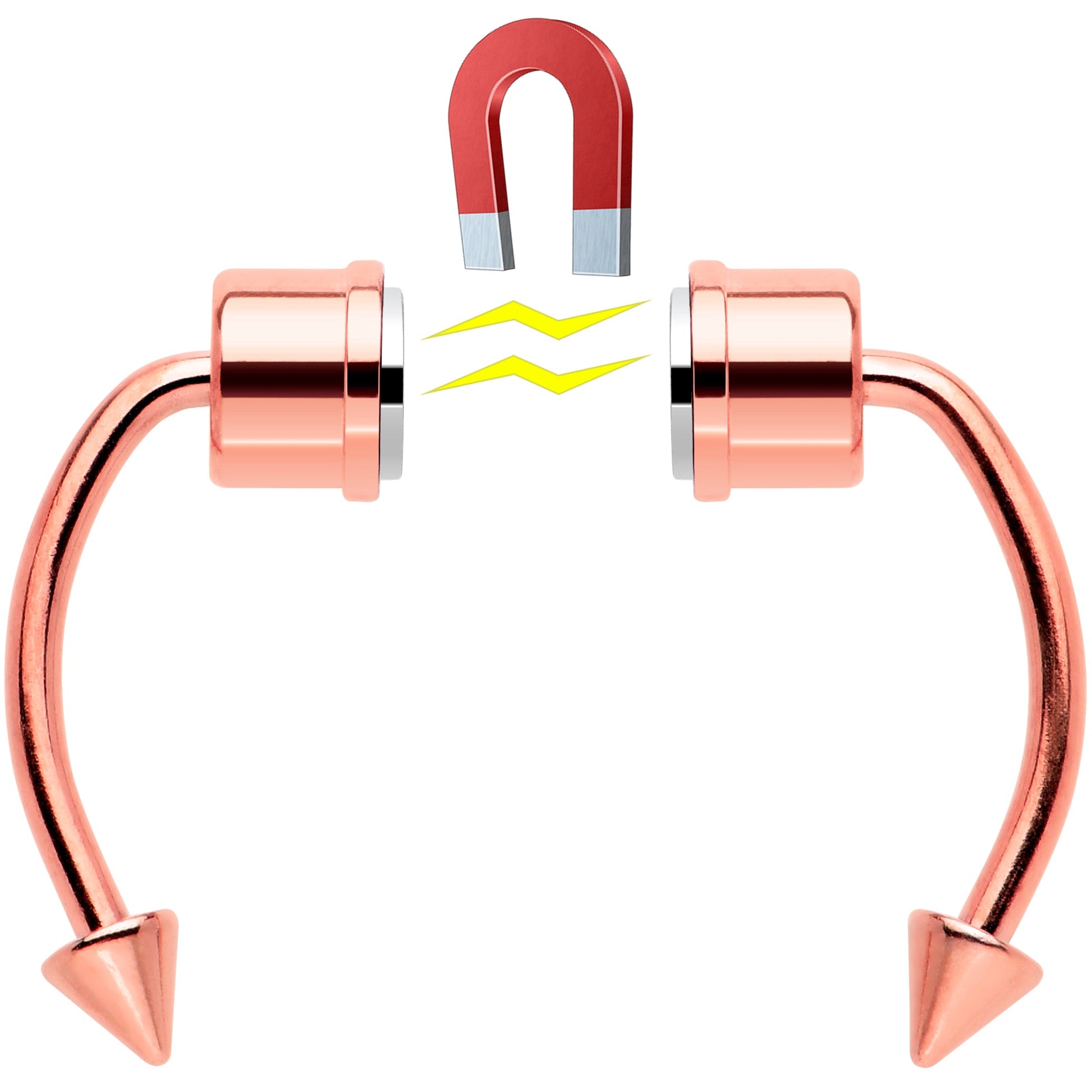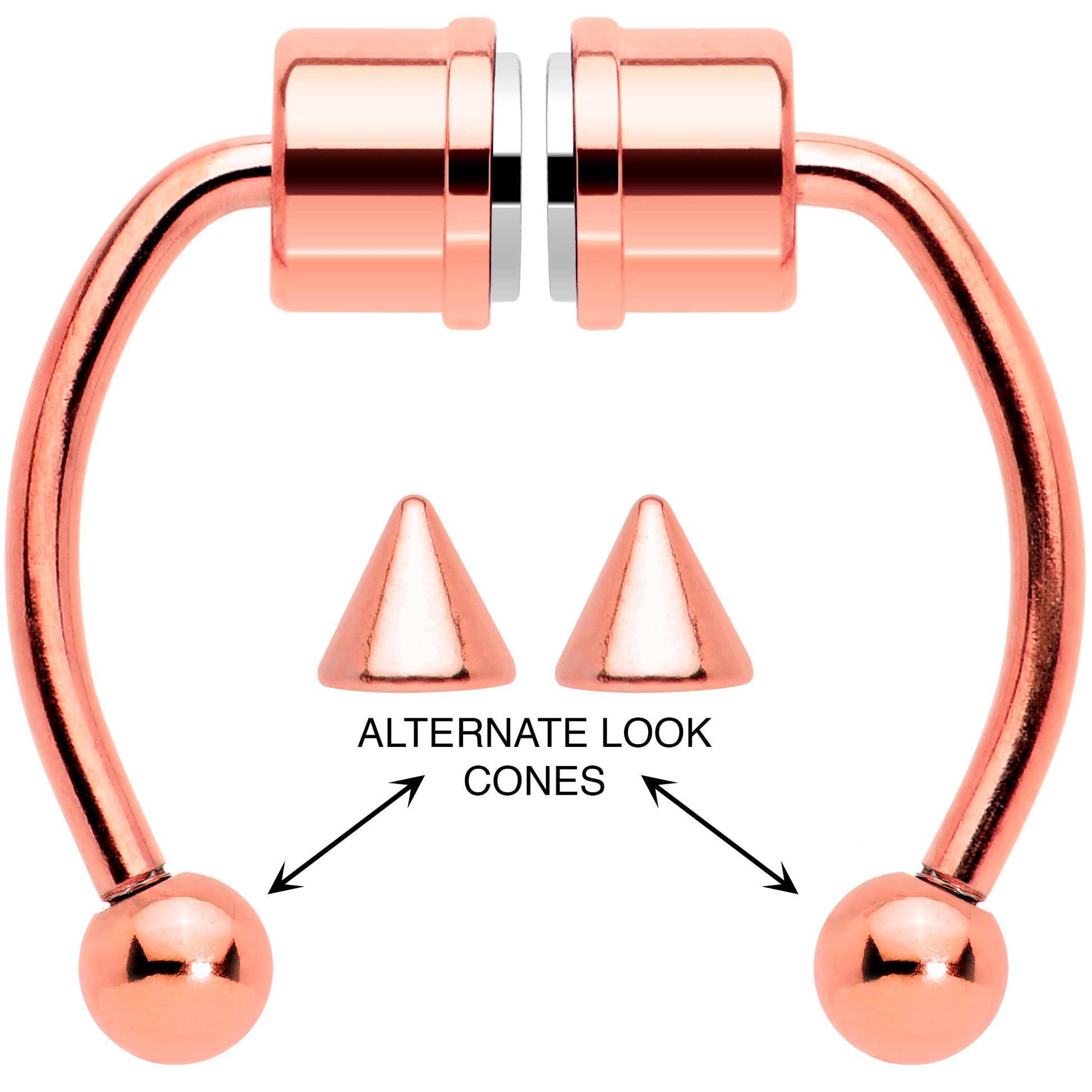 if you like the look but aren't ready to commit yet, this faux septum jewelry is perfect for you! It features a pair of magnets to hold it securely in place without the need of a trip to the piercer. It gives you a classic look that stands the test of time. Try out a new look before you commit with this magnetic faux septum jewelry! This fake septum nose ring set includes an extra set of stainless steel cone ends so you can easily change your look.Specifications
