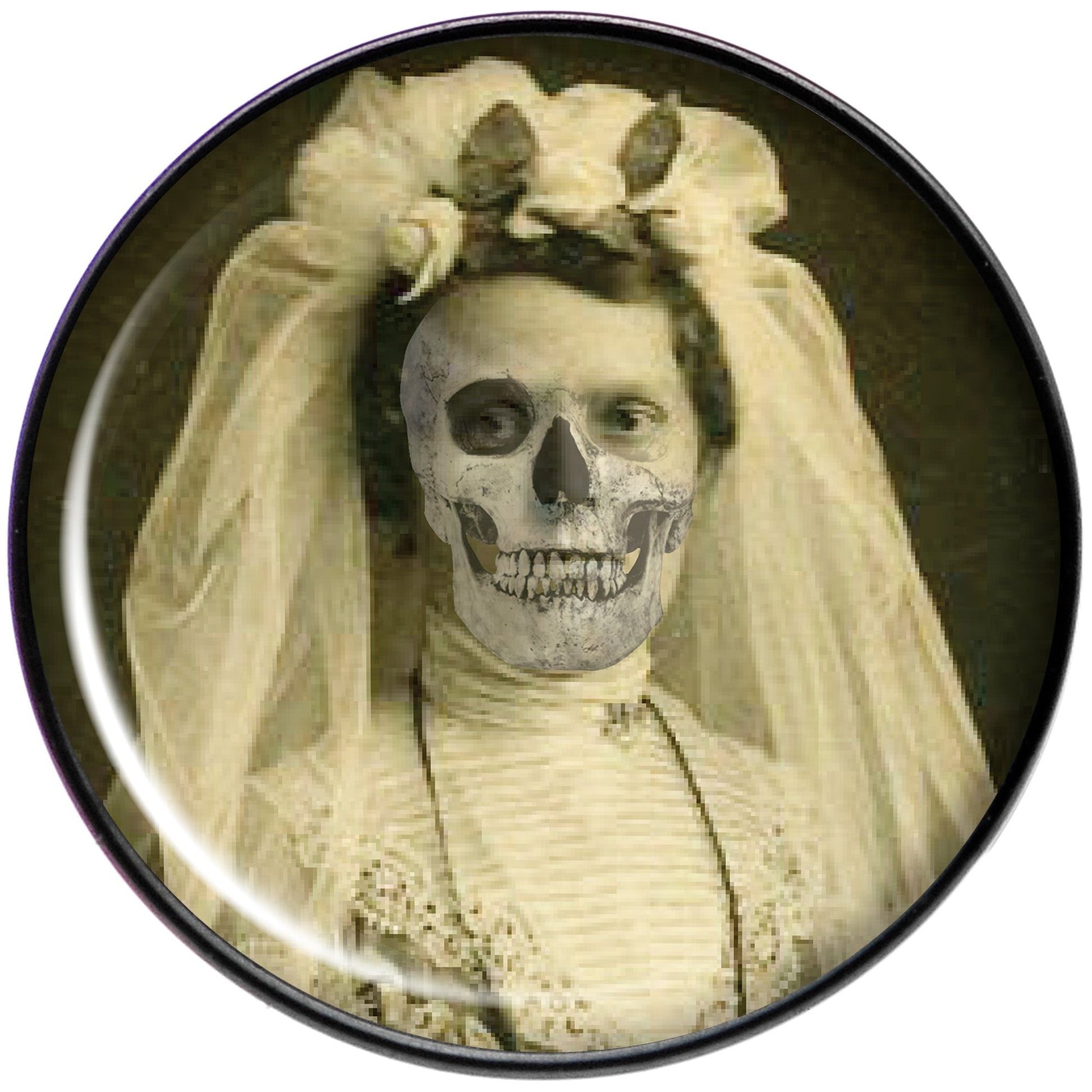 If you love scary scenes and Halloween things then this 14 gauge tongue jewelry is right for you! Made with a 5/8" black anodized over 316L surgical grade stainless steel straight barbell, this belly button ring features an antique looking picture of a skeleton bride logo inlay top.