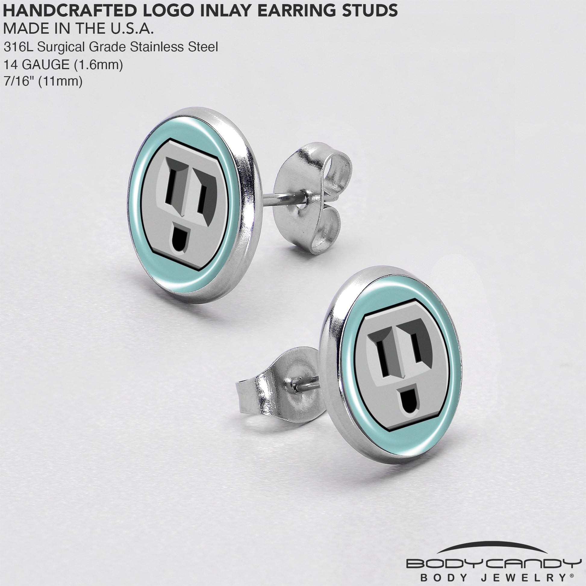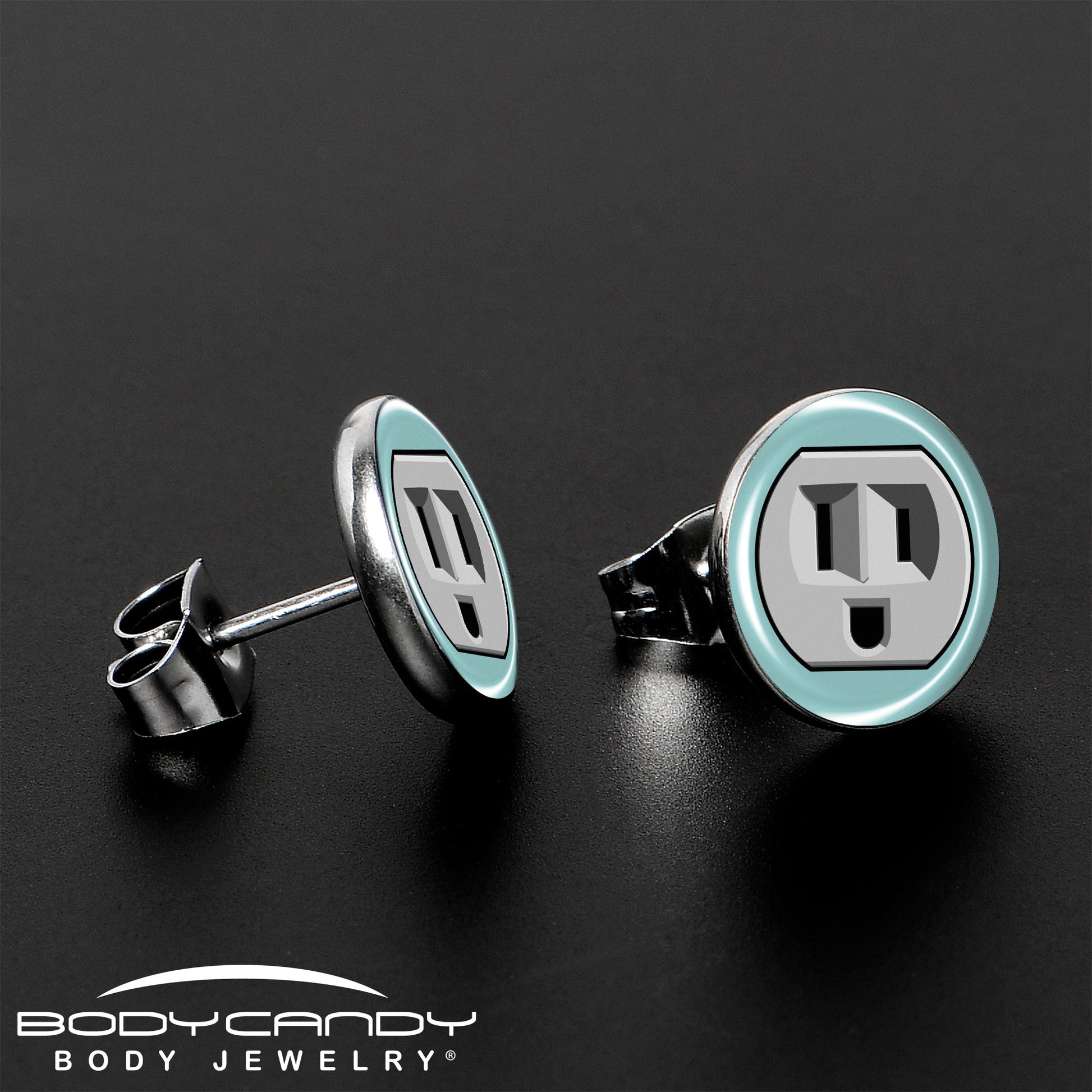 If you're feeling plugged in and you're ready to power up, let the world know with these stud earrings for pierced lobes. They're made with stainless steel straight posts with friction backs for a secure fit. Each one features a grey electrical outlet on a blue background. The sockets in the outlet appear to be sporting a smiling face for days when you're fully charged. Get lit up with the smiling faces on these charming earrings. Sold as a set of two.