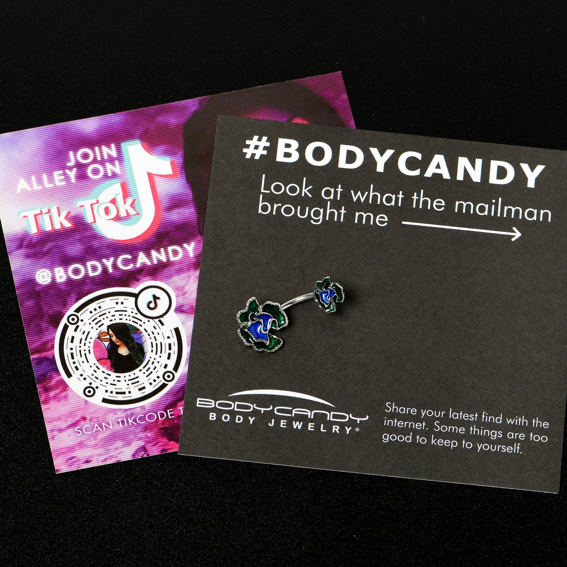 It's always springtime when you're rocking this 14 gauge navel ring! It's made with a 3/8" durable 316L surgical grade stainless steel curved barbell. Each of the ends features a multi-dimensional flower charm, embellished with green and blue. Let the flowers bloom with this floral belly piercing piercing jewelry!Specifications