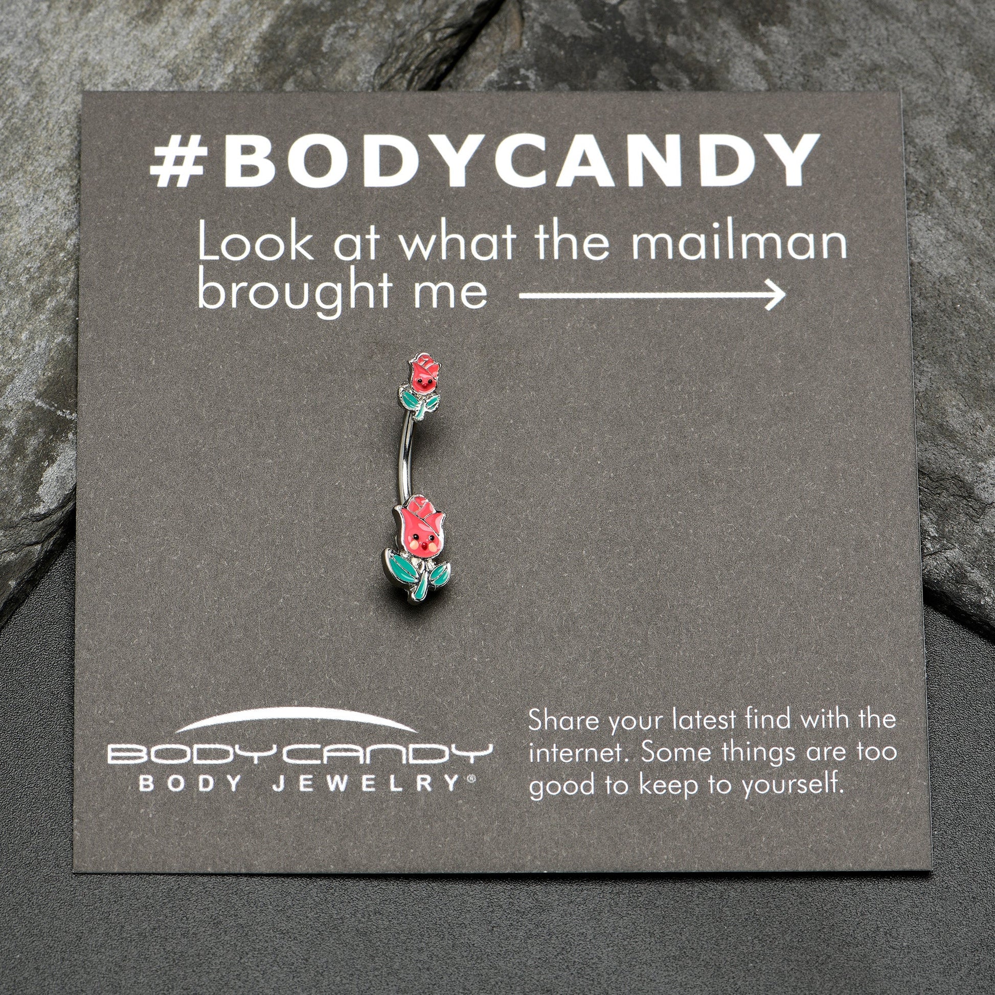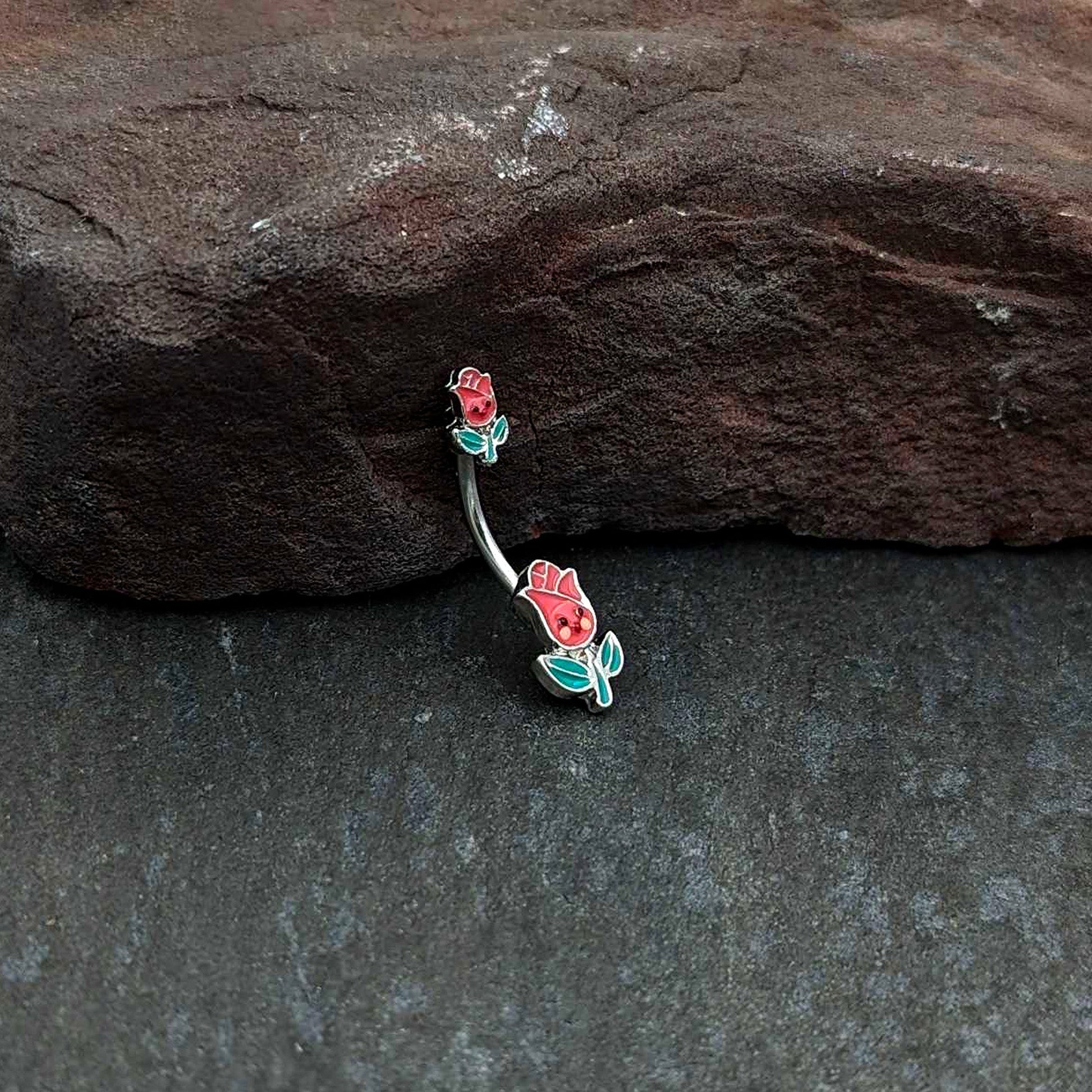 The roses on this 14 gauge navel ring look delighted to be adorning your piercing! It's made with a 3/8" durable 316L surgical grade stainless steel curved barbell. Each of the ends features a rose flower charm, with a red inlaid blossoms and green inlaid leaves and stems. They also feature cheerful faces on the blossom portions, for a truly winsome touch. Rise to every occasion with with this endearing floral belly piercing jewelry!Specifications