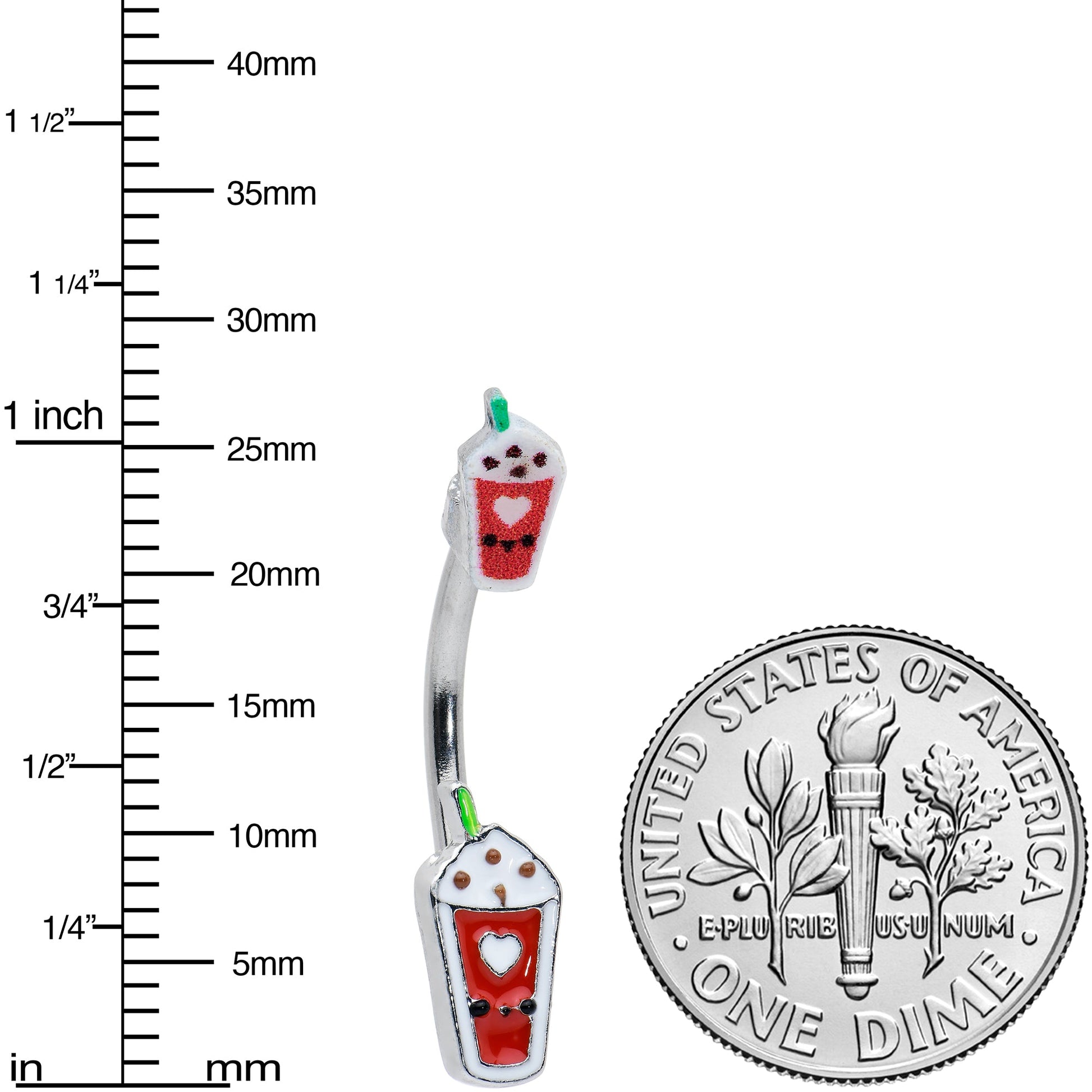 This is one sweet treat you won't want to eat, when you're rocking this 14 gauge navel ring! It's made with a 3/8" durable 316L surgical grade stainless steel curved barbell. Each of the ends features a kawaii-inspired pumpkin frappe charm, inlaid in Fall colors, with a charming green straw, and sporting a heart on its label. Get a cool look during the cold days of fall with this yummy pumpkin frappe belly piercing ring!Specifications