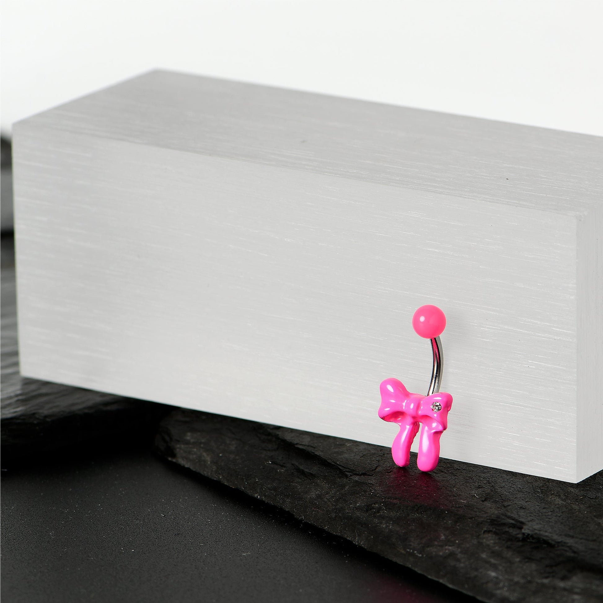 Girlfriend, it is time to update your look with this 14 gauge belly button ring. It is made with a 3/8 inch 316L surgical grade stainless steel curved barbell. It has a 5mm top ball end that is a rich shade of pink. The bottom end features a matching pink bow charm, embellished with a clear gem for an added bit of girly glam. This belly piercing ring is a collaboration between Body Candy and Sydney Belle, so you know your are going to love it.