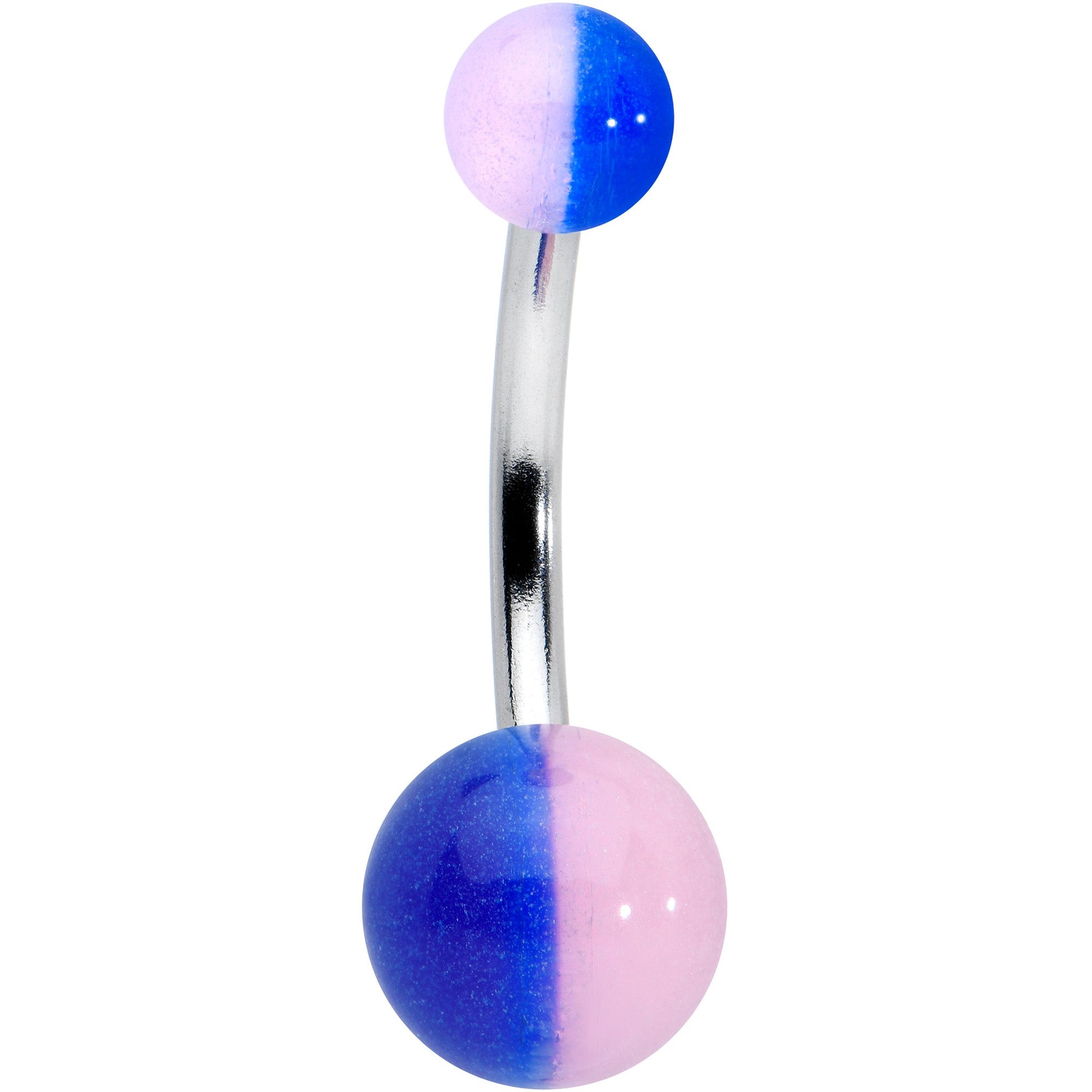 Be prepared for any event with simple belly jewelry to suit your style. This 14 gauge navel ring is made with a 3/8" durable 316L surgical grade stainless steel curved barbell with a 5mm top ball end and an 8mm bottom ball end. The ball ends feature blue, and pink acrylic ball ends for a fun and colorful look that won't overwhelm. Add a splash of color to your look with this cheerful belly piercing ring!Specifications