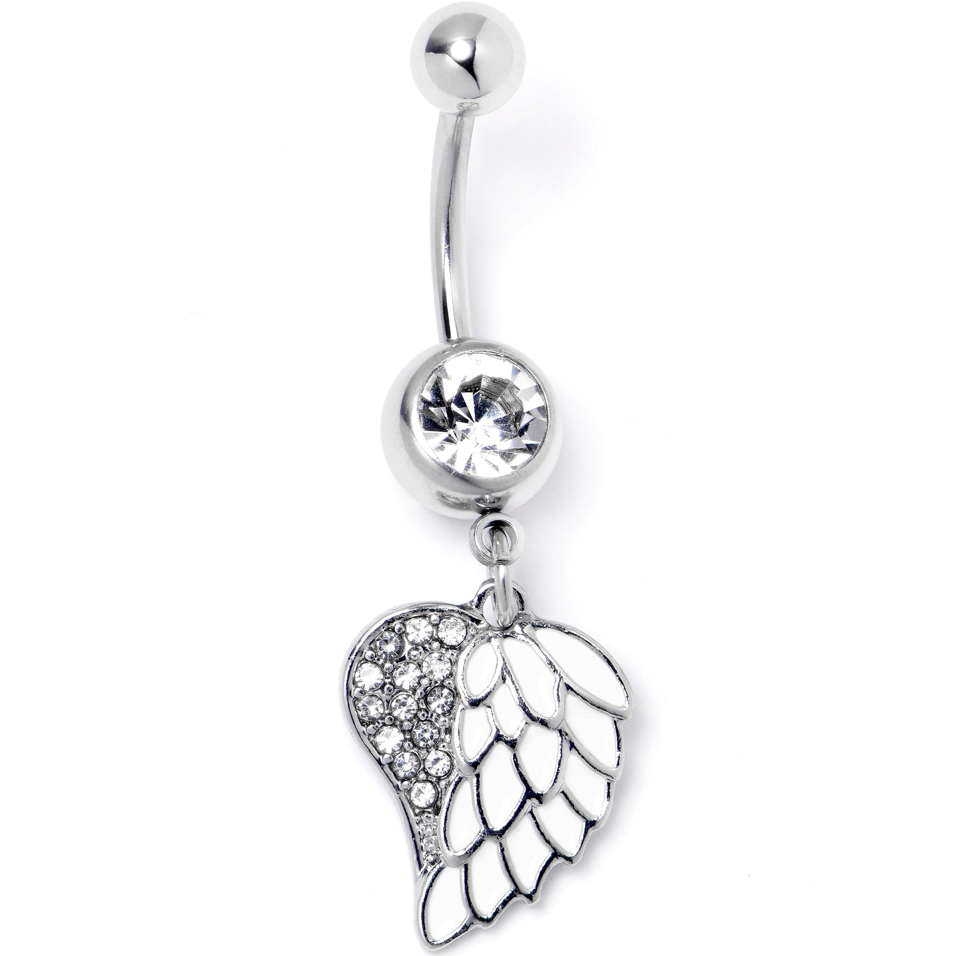 Give yourself a heavenly new look with this 14 gauge navel ring. It's made with a 3/8 inch 316L surgical grade stainless steel curved barbell with a 5mm top ball end.The bottom ball end is 8mm and set with a clear gem. Dangling beneath is a heart shaped charm featuring an angel's wings, with one side paved with clear gems. The other side features white inlay and simply styled feather details Let your look and your spirit soar with this stylish and spiritual belly piercing jewelry.Specifications