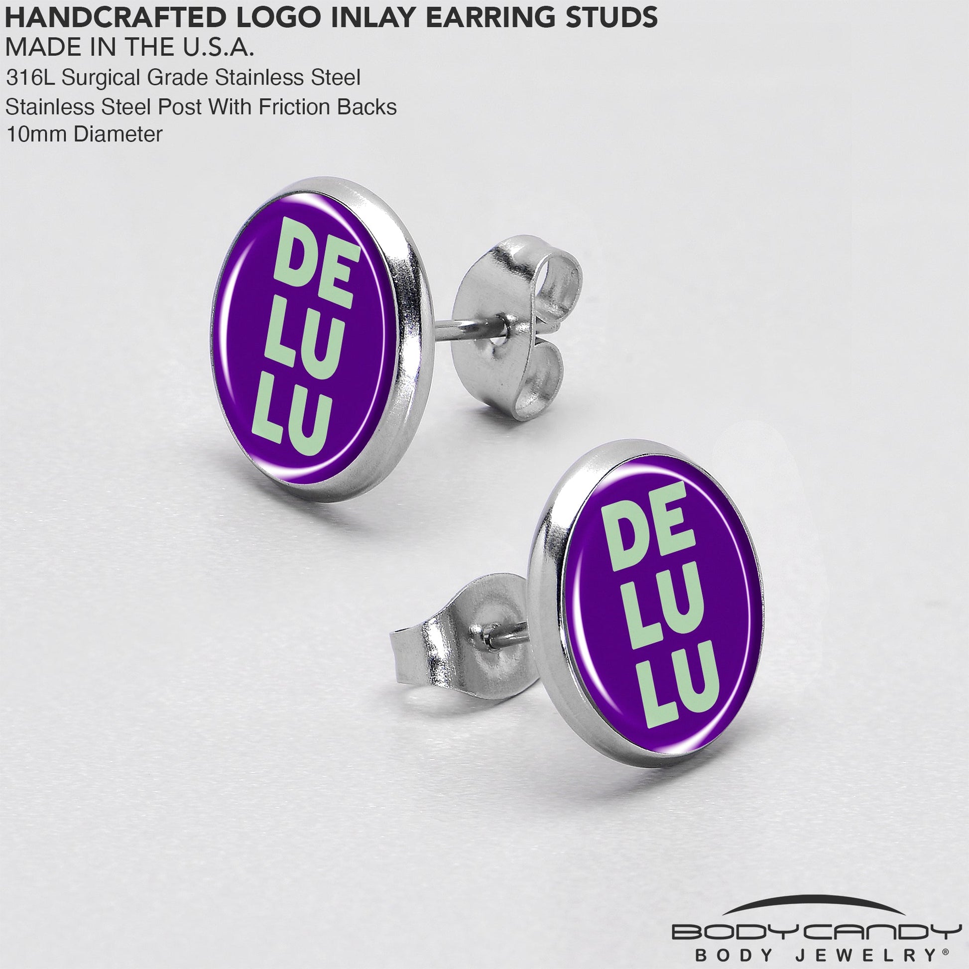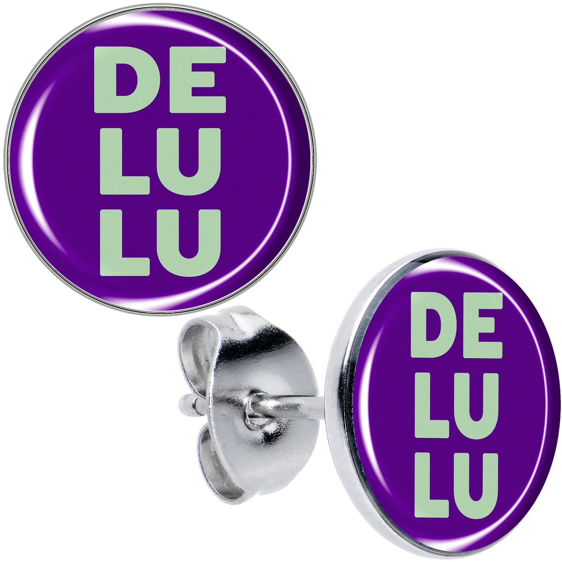 Get crazy stylish with these stud earrings for pierced lobes. They're made with stainless steel straight posts with friction backs for a secure fit. Each one features a purple disc charm with the word "delulu" written on it in green. You'll be crazy about the look of these striking earrings. Sold as a set of two.