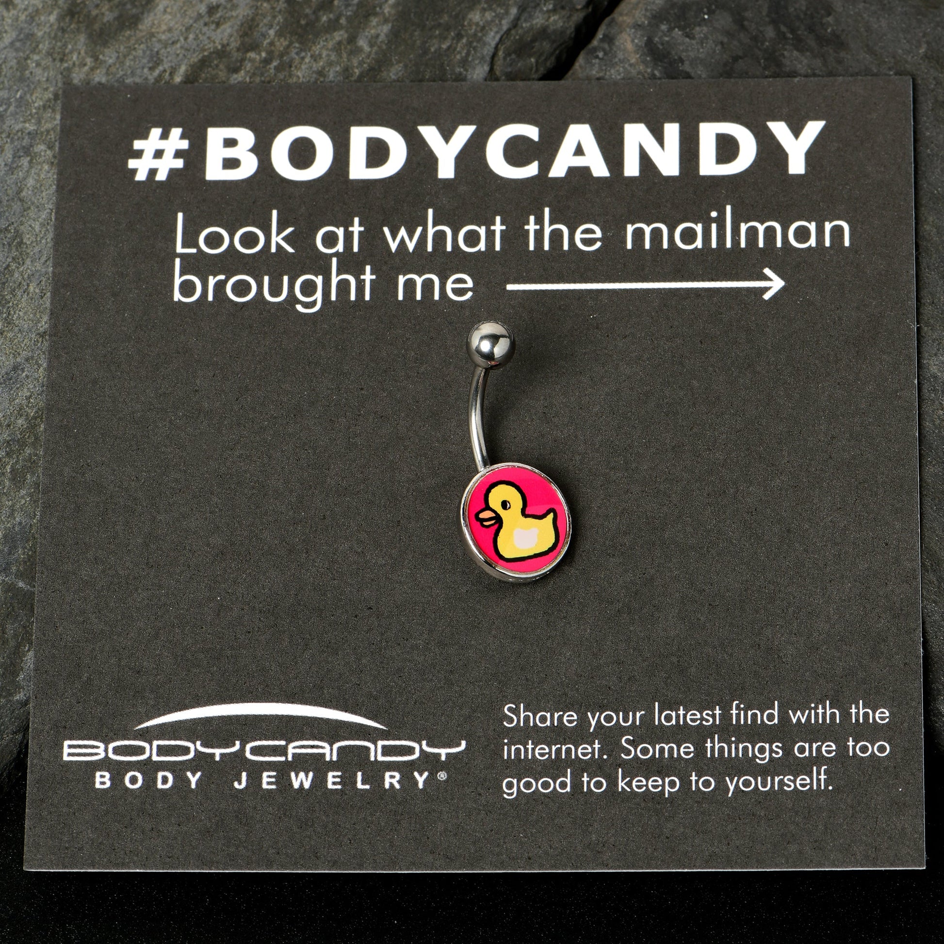 The bath ducky on this 14 gauge navel ring is definitely the one for you! It's made with a 7/16" durable 316L surgical grade stainless steel curved barbell with a 5mm top ball end. It features a disc shaped ducky charm, with a vibrant pink background. The duck is a traditional yellow with a white embellishment on its wing. Get down with the ducks with this darling ducky belly piercing ring!